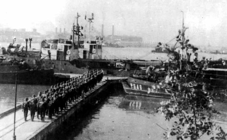 Tập thể cán bộ, thủy thủ đội tàu số 5 đã vận chuyển 60 tấn vũ khí, hàng hóa chi viện chiến trường Nam Bộ, tháng 12/1963. Ảnh: Tư liệu