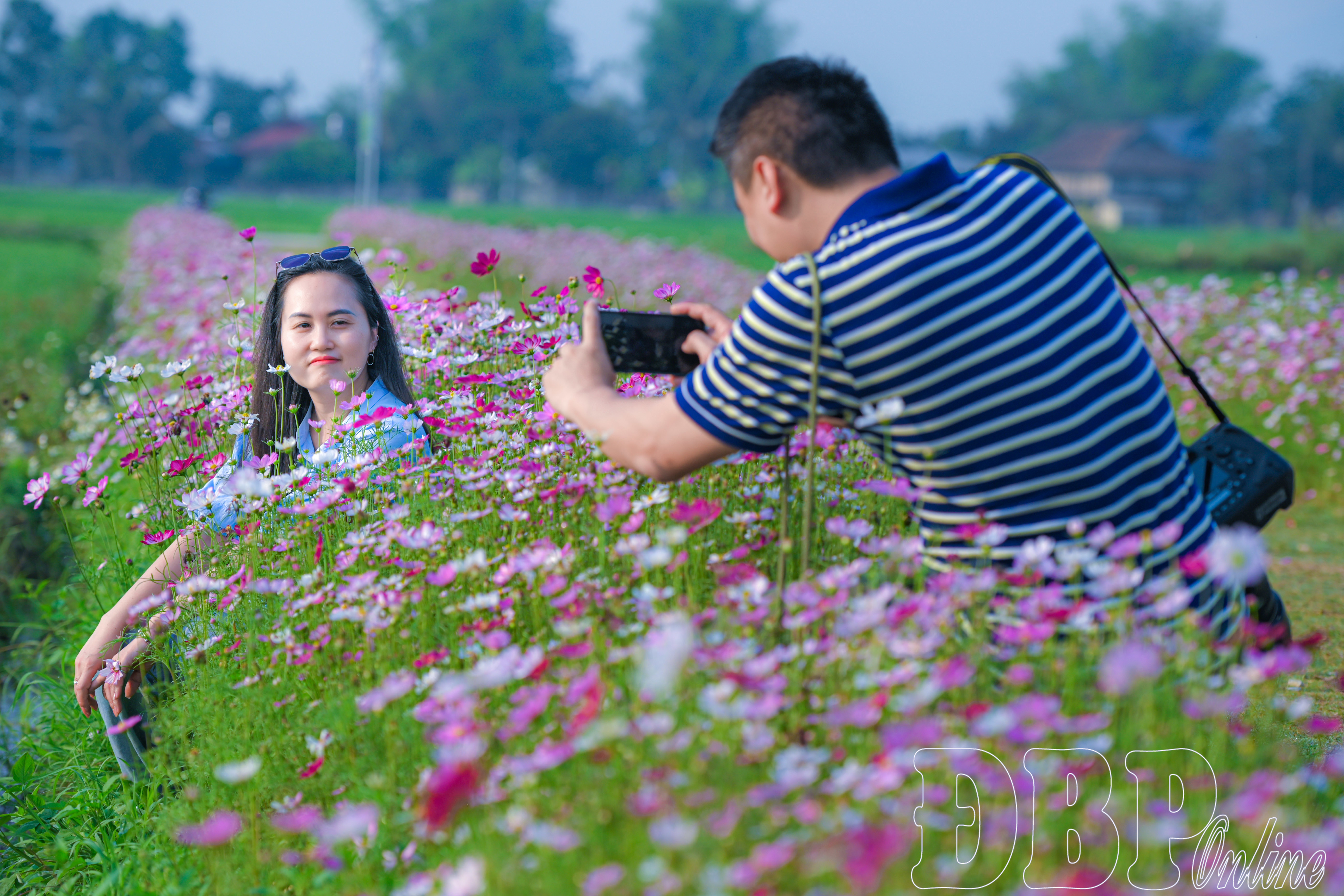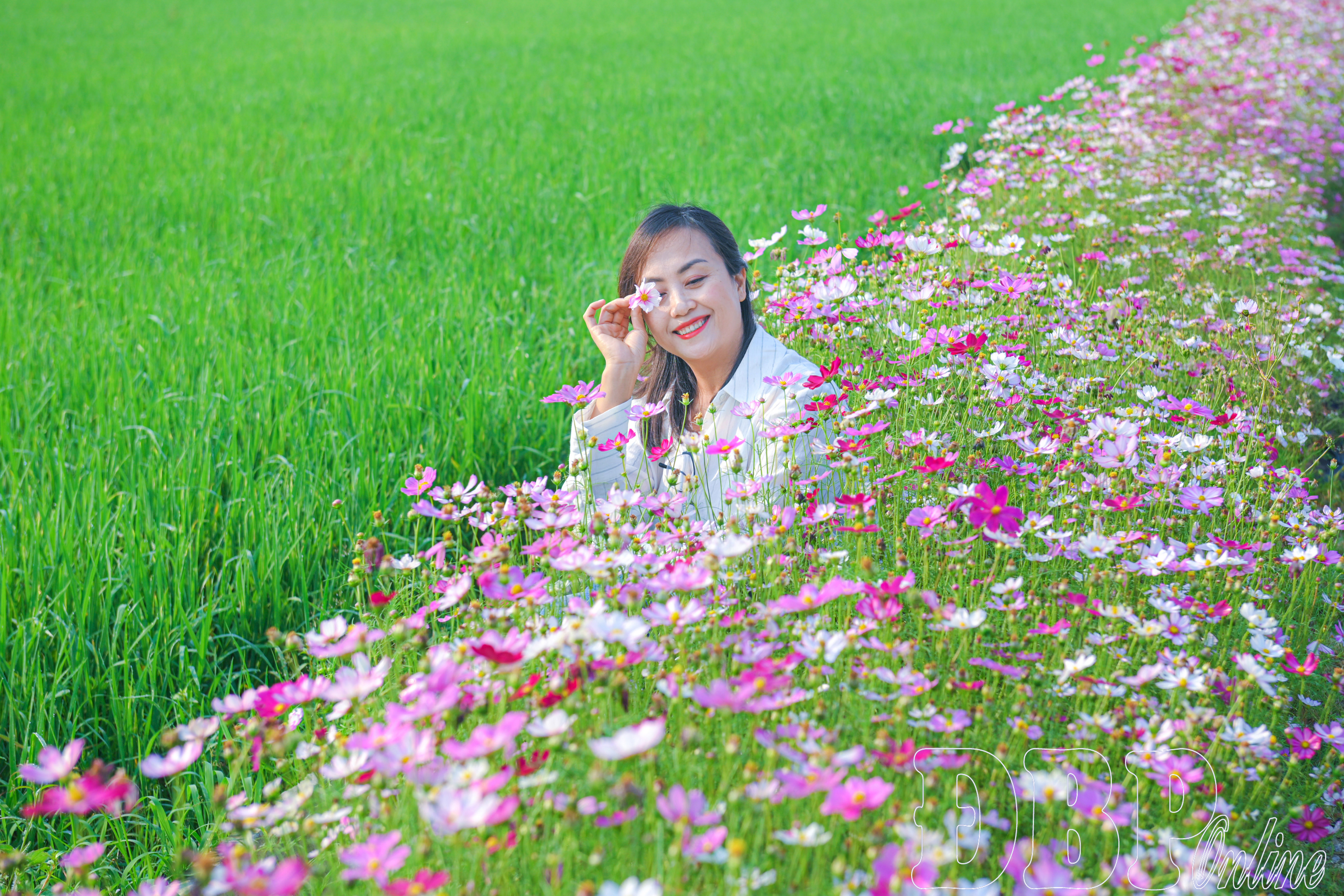 Đứng giữa đường hoa, du khách có thể mở tầm mắt nhìn ra bốn phía là cánh đồng rộng lớn, xa xa là những nếp nhà yên bình. Sự hòa quyện giữa màu hoa rực rỡ và sắc xanh của đồng ruộng tạo nên một khung cảnh dung dị mà cuốn hút. Đây cũng là điểm dừng chân được nhiều người lựa chọn để chụp ảnh, ghi lại những khoảnh khắc đẹp giữa thiên nhiên trong lành, nhất là vào buổi sáng sớm và chiều muộn.