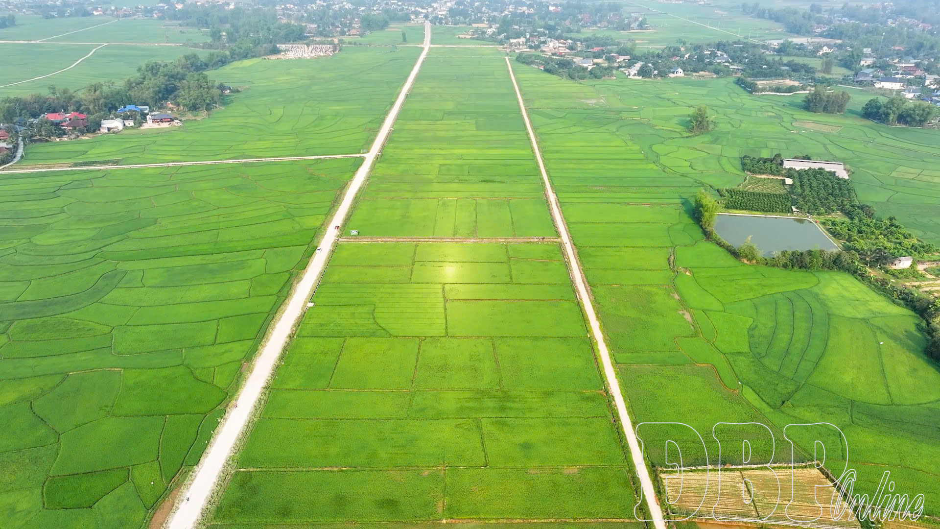 Xung quanh đường hoa là những thửa ruộng xanh mát mắt.