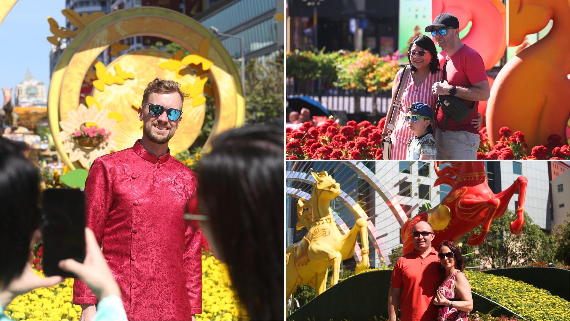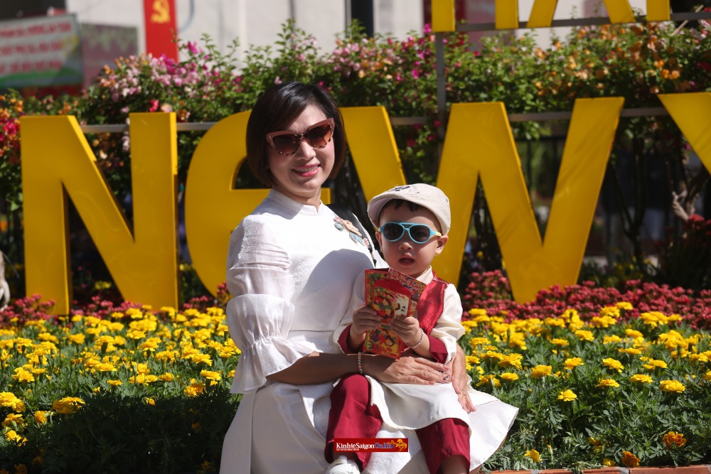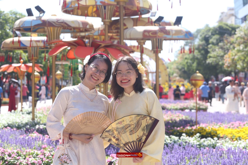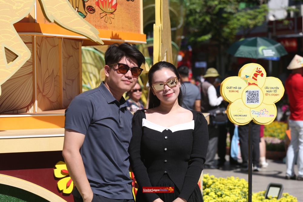 Chị Phan Yến (ngụ TPHCM) cho biết chị và bạn đã đến từ 8 giờ sáng để tránh đông nhưng vẫn bất ngờ trước lượng khách tham quan. “Năm nào tôi cũng đi đường hoa. Không khí rất vui, rộn ràng; mọi người diện áo dài chụp hình nên nhìn rất có không khí Tết".