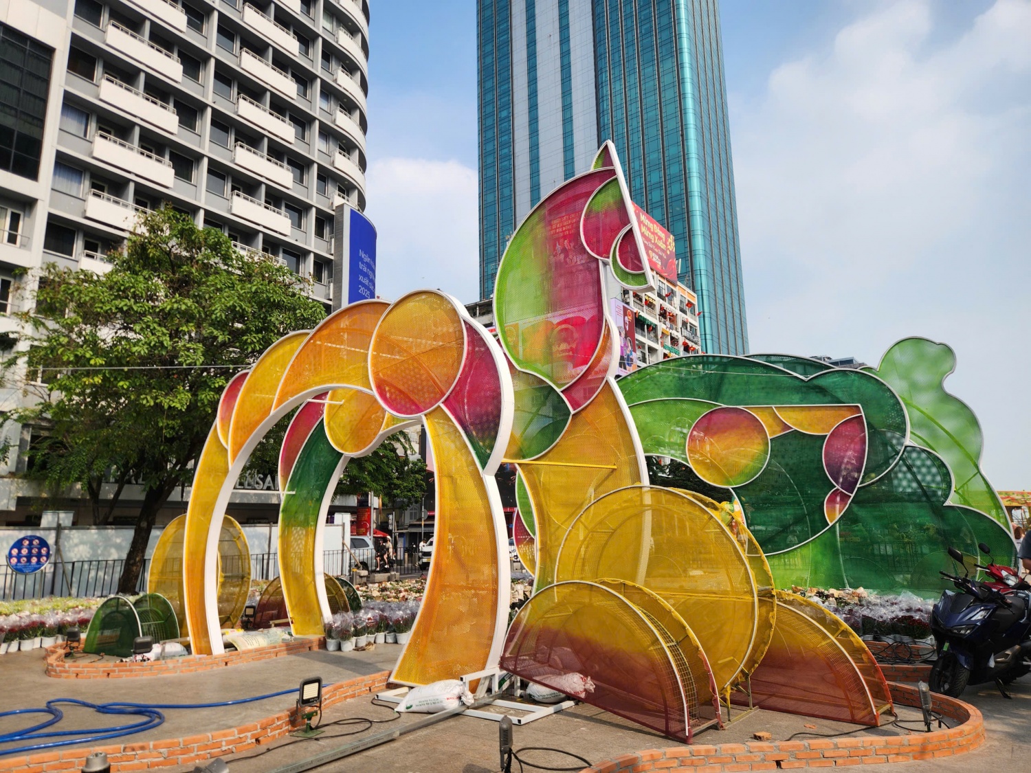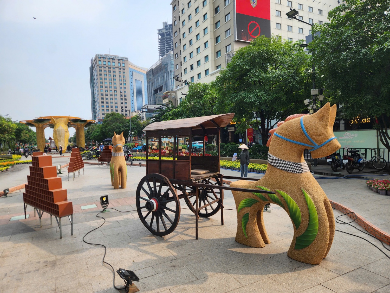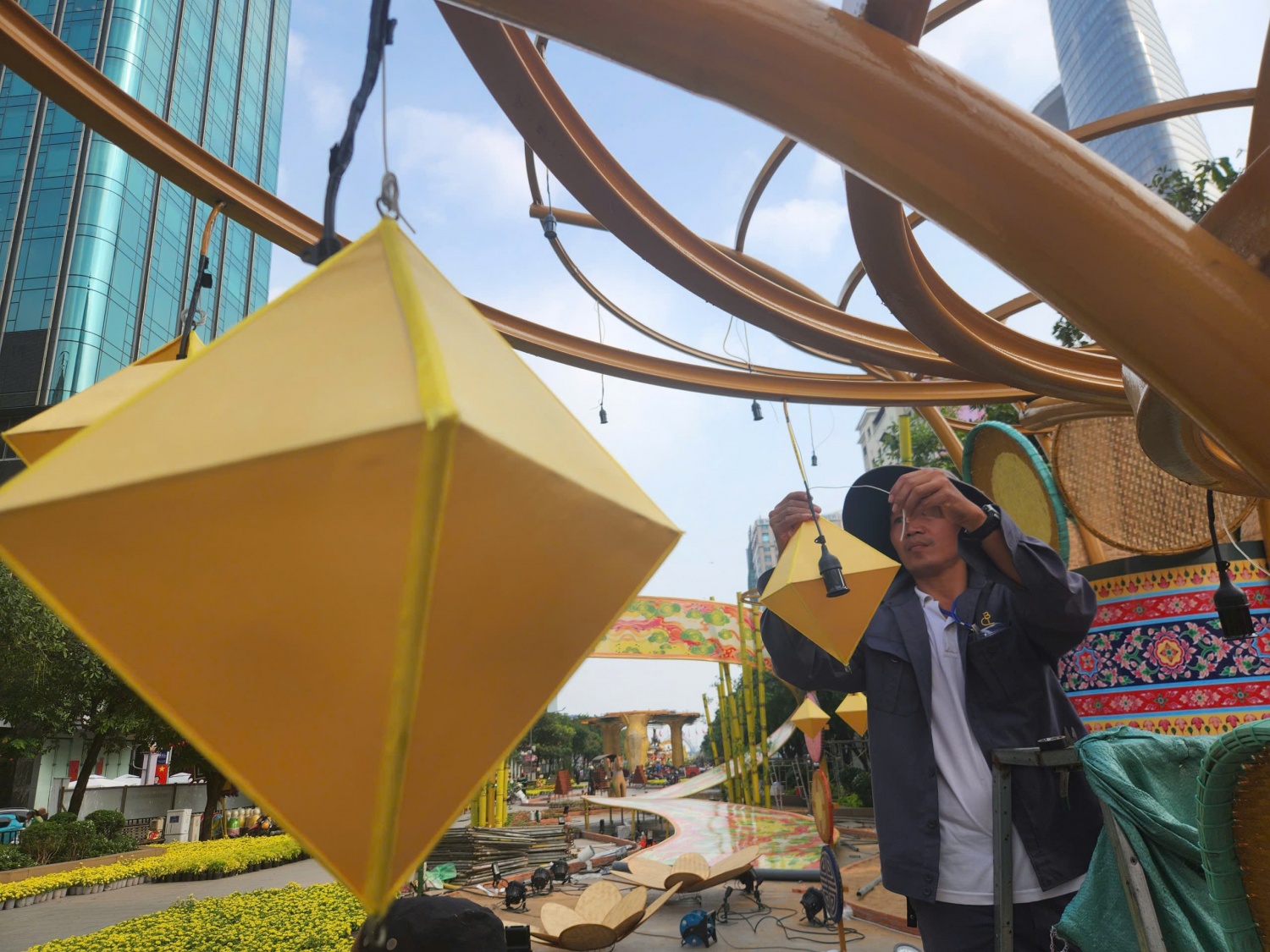 Trên công trường, lực lượng thi công làm việc liên tục, lắp đặt và gia cố các hạng mục trang trí. Phương tiện vận chuyển vật tư ra vào nhộn nhịp, đưa hoa, cây cảnh, thiết bị chiếu sáng và các cấu kiện kỹ thuật đến phục vụ quá trình hoàn thiện.