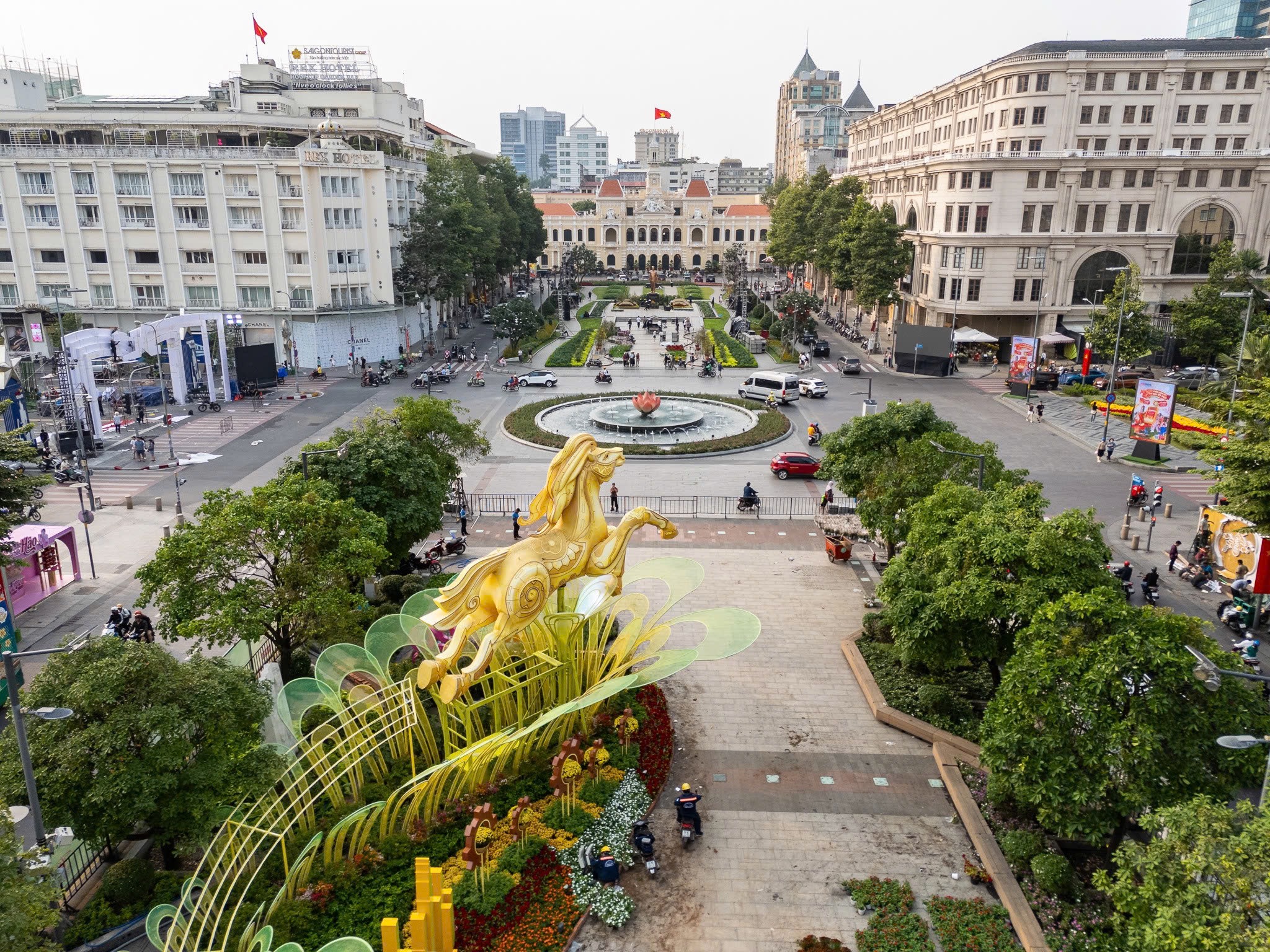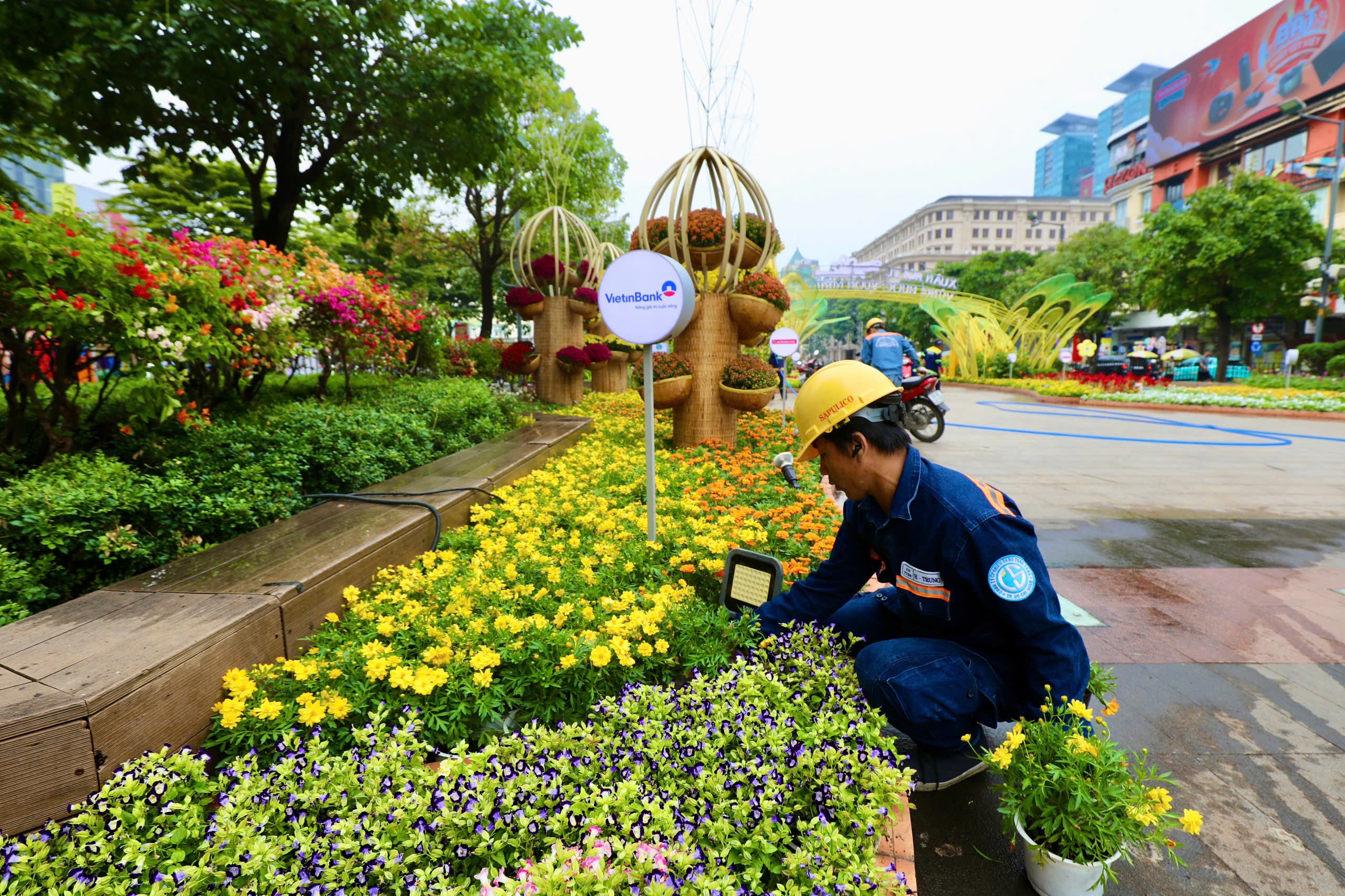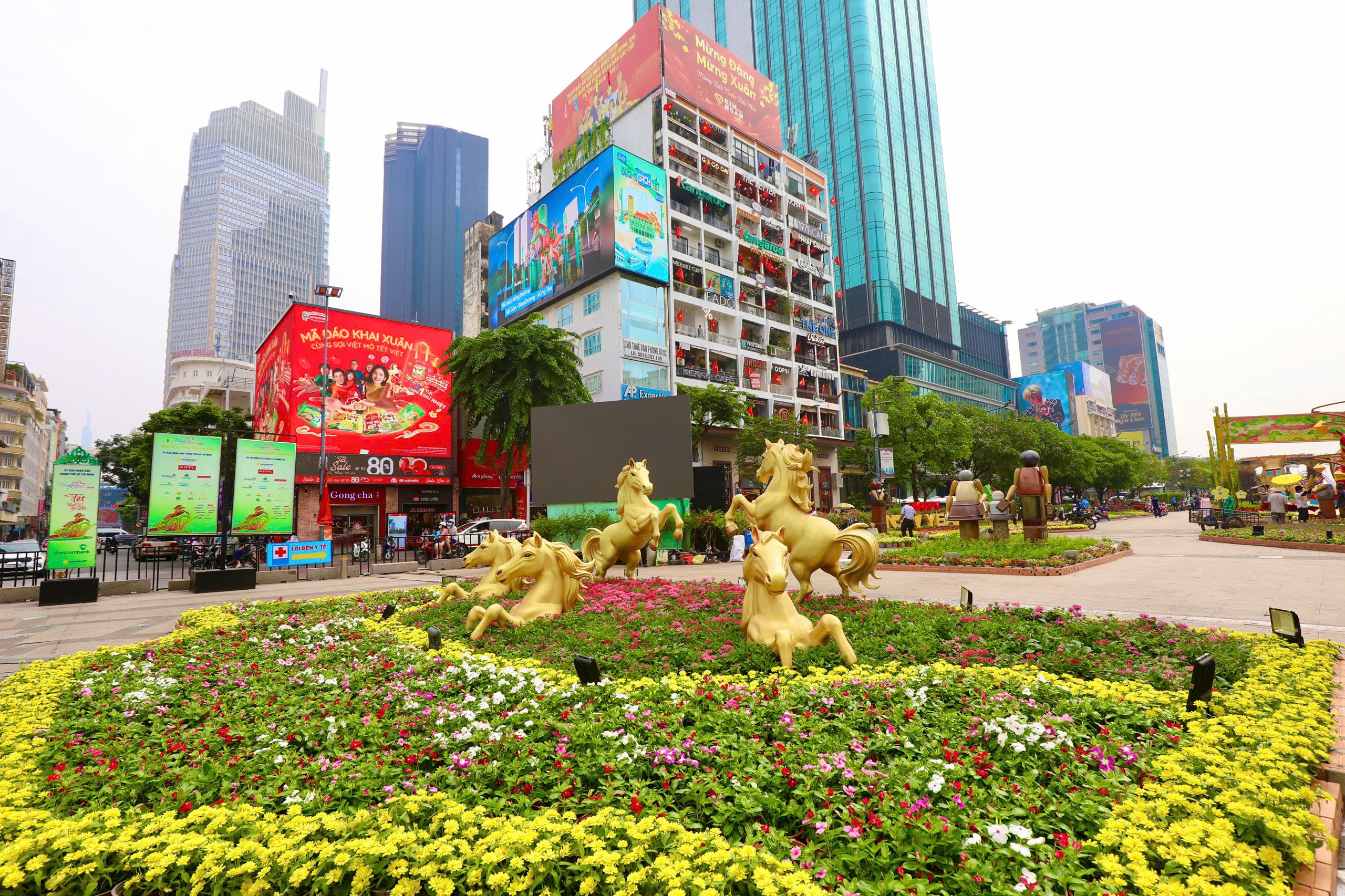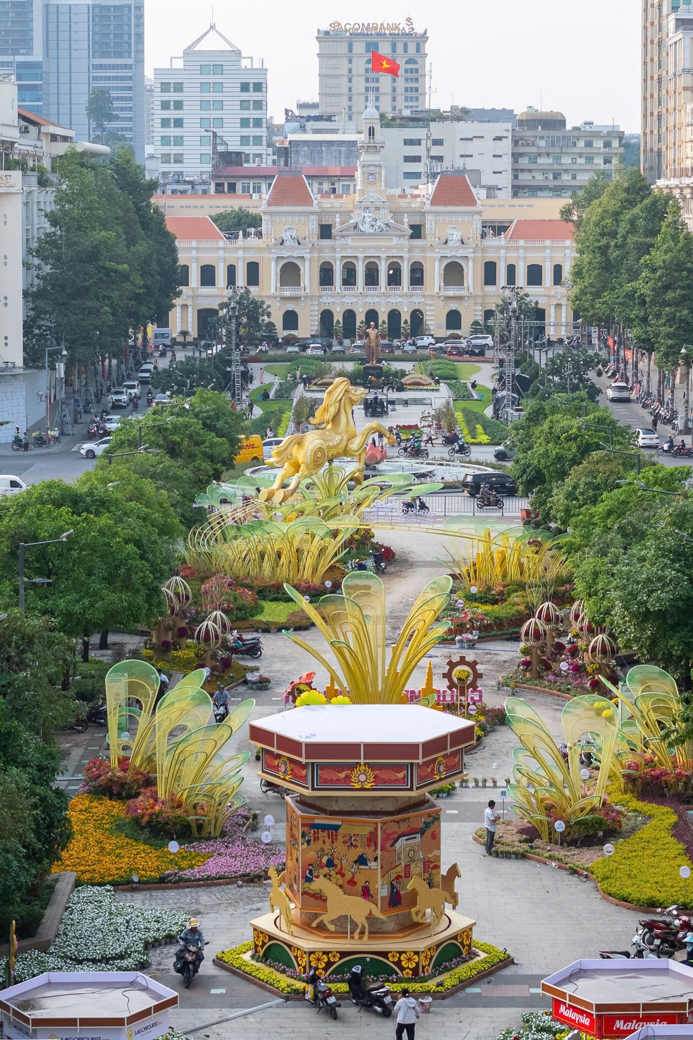 Đường hoa Nguyễn Huệ Tết Bính Ngọ 2026 chọn sắc vàng làm chủ đạo, tạo điểm nhấn rực rỡ tại khu vực trung tâm TPHCM.