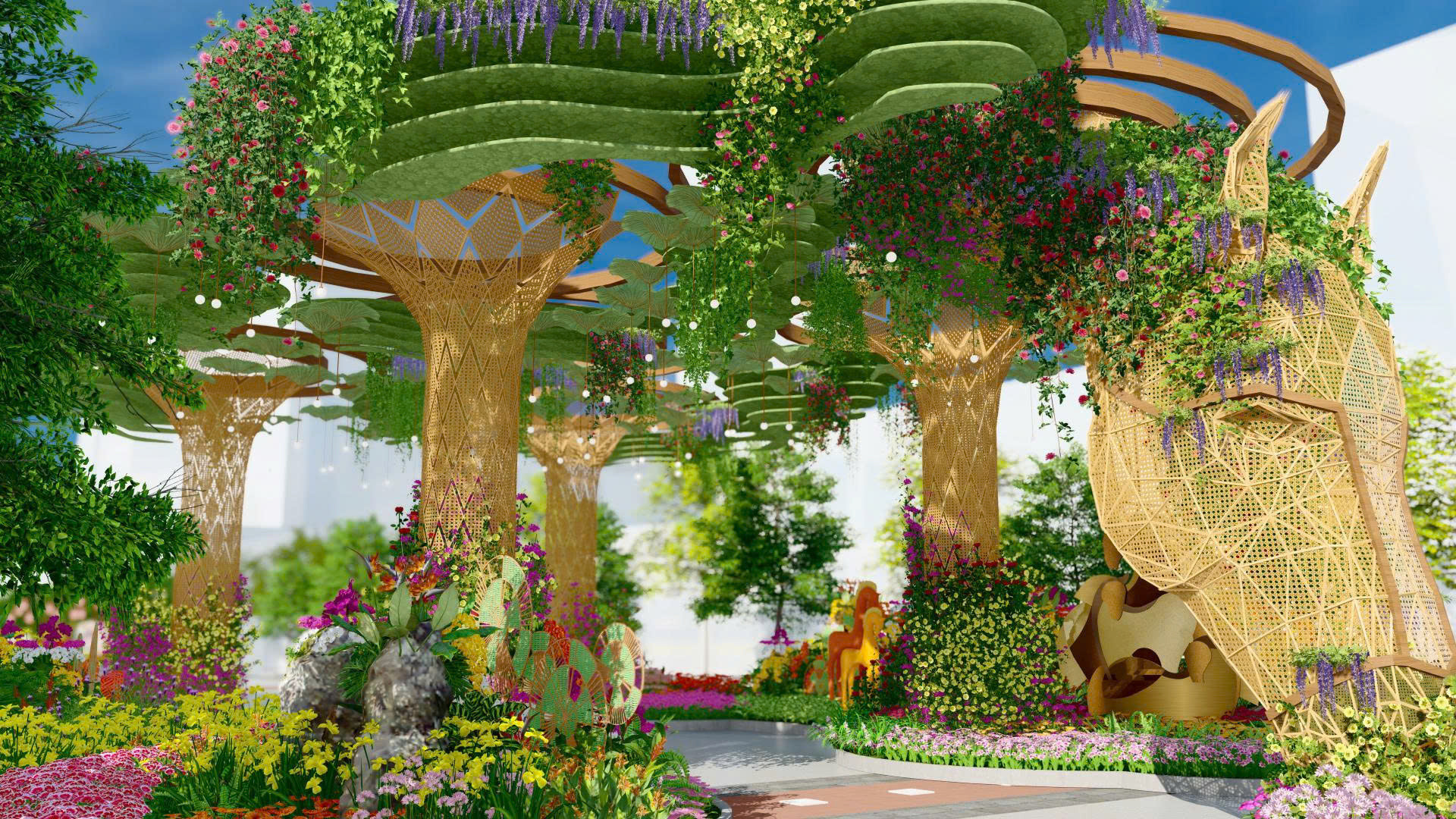Chế tác từ chất liệu tre đan hình học thân thiện với môi trường, chú ngựa khổng lồ này tạo ra một không gian sinh thái đa tầng, nơi du khách có thể len lỏi giữa thảm thực vật để cảm nhận sự thư thái, thong dong.