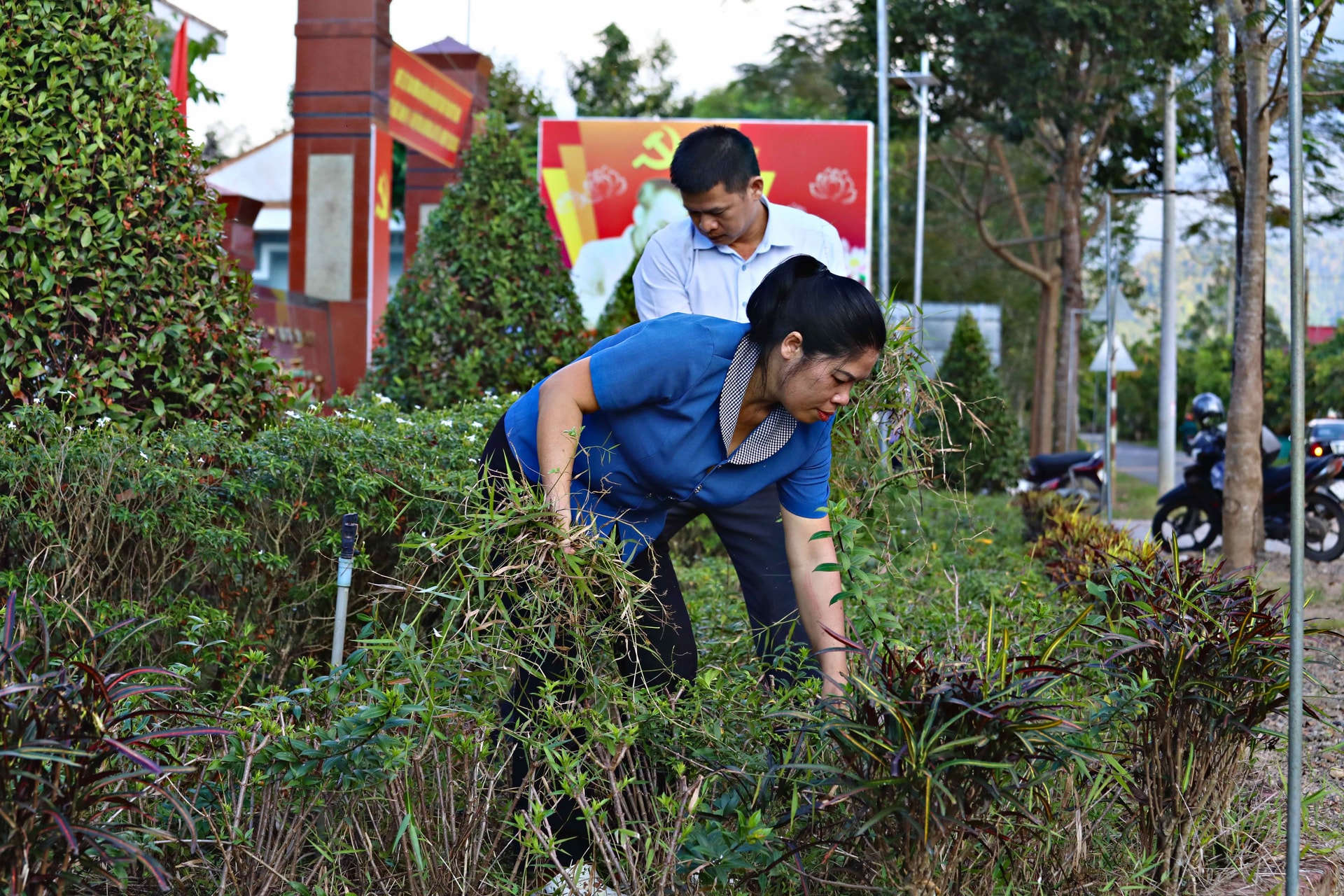 Công chức, viên chức xã Đạ Tẻh 2 thường xuyên tổ chức chăm sóc cây xanh, dọn dẹp định kỳ trước cổng trụ sở cơ quan