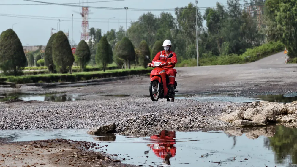 Nghiêm trọng nhất là đoạn đường dài khoảng 500m dẫn vào cảng quốc tế Gemadept Dung Quất. Đoạn đường này chi chít hố sâu, nhiều điểm đọng nước lớn khiến xe máy dễ trượt ngã, còn xe tải, container phải liên tục né tránh. Khung cảnh hỗn loạn diễn ra thường xuyên, nhất là khi từng đoàn xe tải trọng lớn nối đuôi vào cảng.