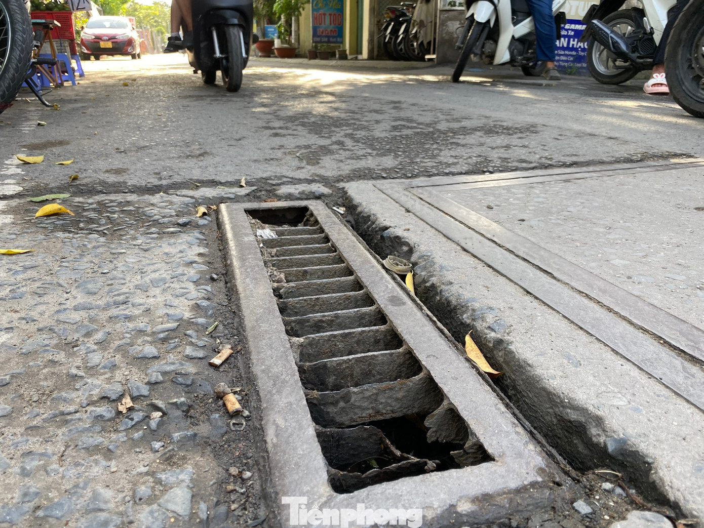 Mặt đường hẹp, nhiều đoạn chỉ vừa đủ cho một làn xe lưu thông một chiều nên thường xuyên xảy ra ùn ứ, đặc biệt là vào giờ cao điểm. Trong ảnh: Nắp cống giữa đường hoen gỉ, tiềm ẩn nguy cơ mất an toàn giao thông.