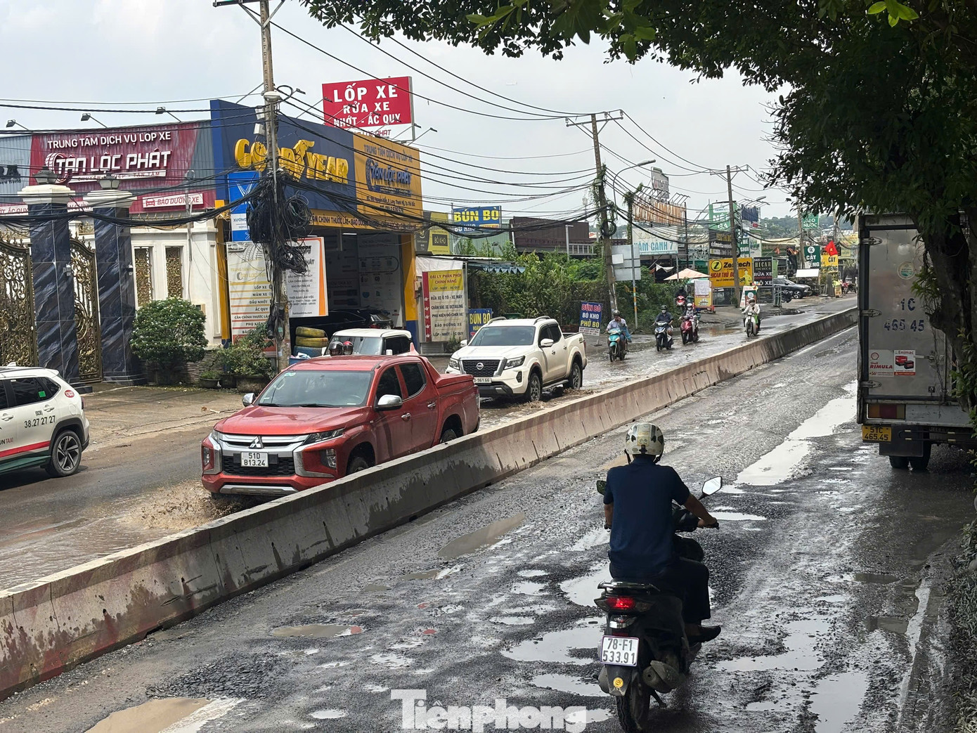 Người đi xe máy phải lách qua từng ổ gà, cố giữ thăng bằng giữa dòng xe tải và ô tô di chuyển chậm chạp.