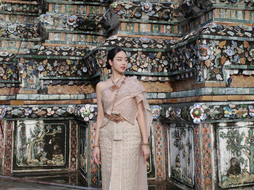 Tại “xứ sở Chùa Vàng,” Hoa hậu Thanh Thủy xuất hiện nền nã, thanh lịch với trang phục truyền thống Chut Thai, tham quan chùa Wat Arun – một trong những biểu tượng văn hóa tâm linh nổi tiếng tại Bangkok.
