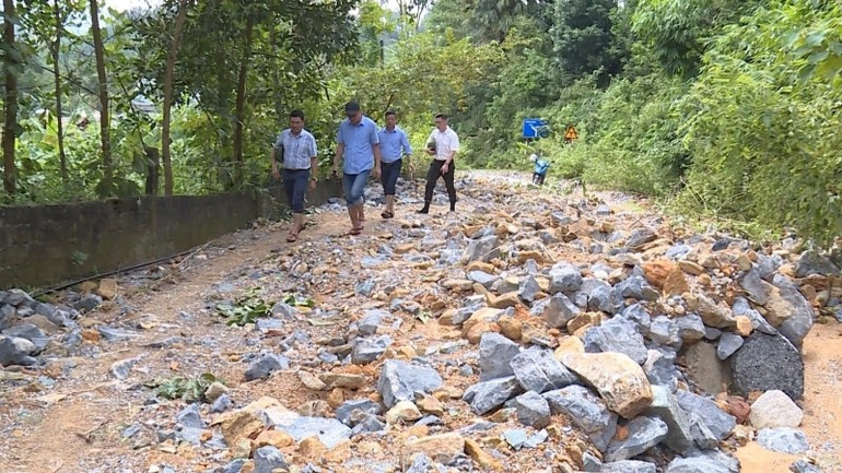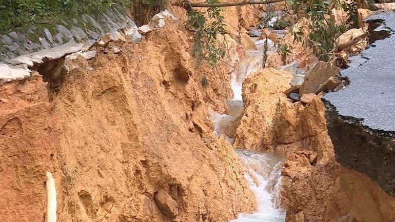 Nước lũ cuốn phăng lớp thảm nhựa mặt đường, tạo thành các rãnh cắt ngang, có nơi sâu tới 1,5m. Phía ta-luy âm cũng bị xói lở, biến thành dòng chảy, trong khi đá cuội, đá mồ côi bị dồn đống ở cuối đường, gây ách tắc.