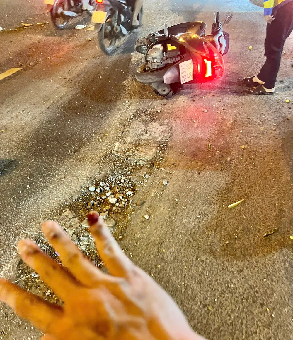 Đáng lo ngại, tối 6-10, anh Nguyễn Thanh Sơn (phường Bình Trưng) phản ánh đến PLO vào lúc 18 giờ, khi điều khiển xe trên đường Nguyễn Hoàng trong điều kiện thiếu sáng, do không kịp phát hiện ổ gà, anh đã vấp và té ngã xuống đường, dẫn đến bị gãy ngón tay khi chống đỡ.