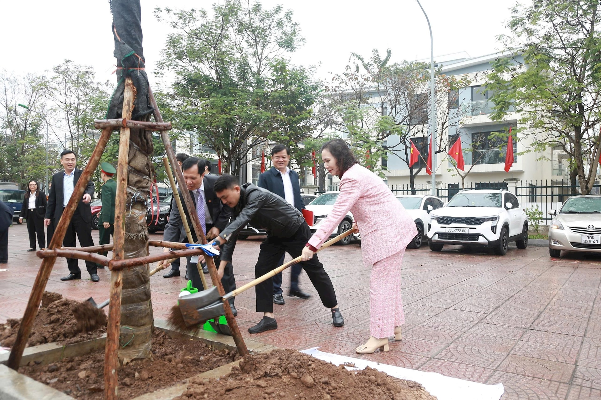 Bí thư Đảng ủy, Chủ tịch HĐND phường Dương Nội Cấn Thị Việt Hà và các đại biểu trồng cây tại lễ phát động. Ảnh: PV