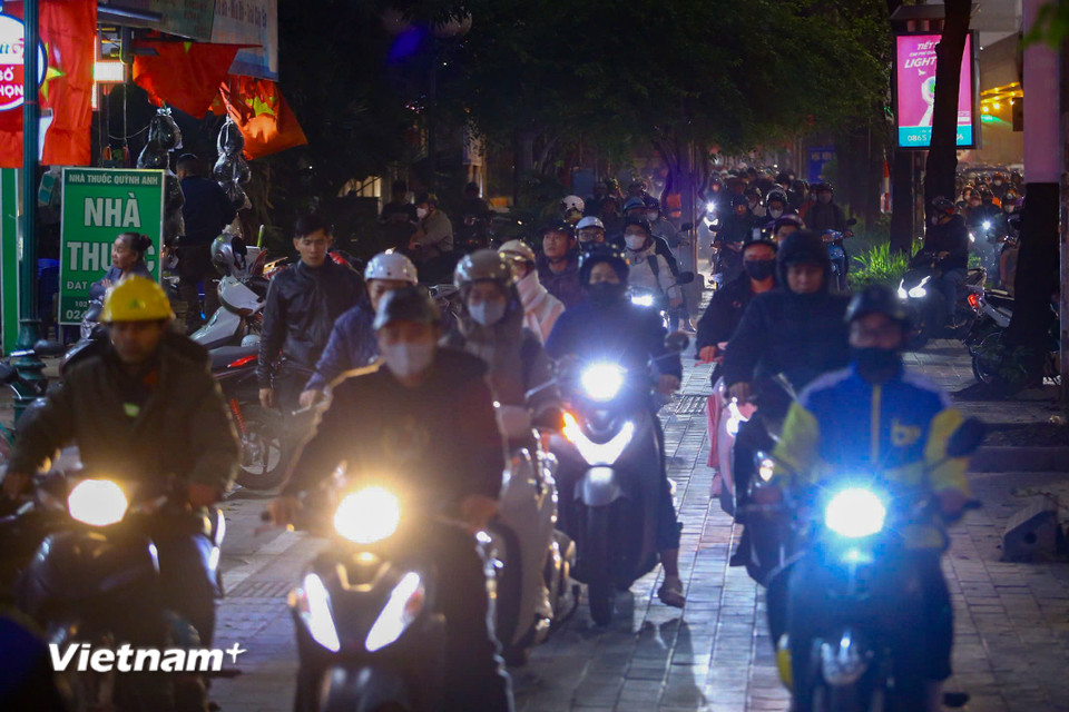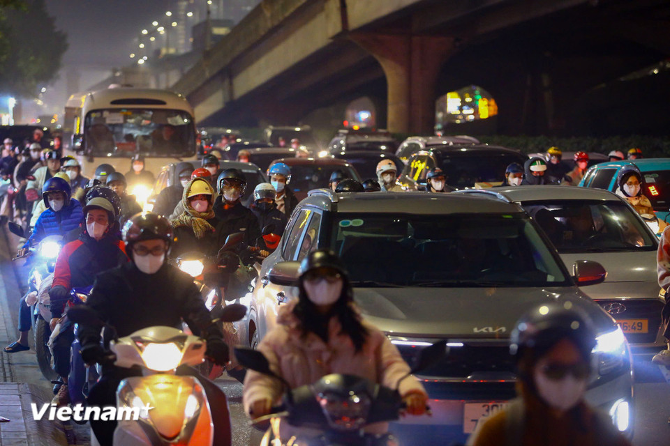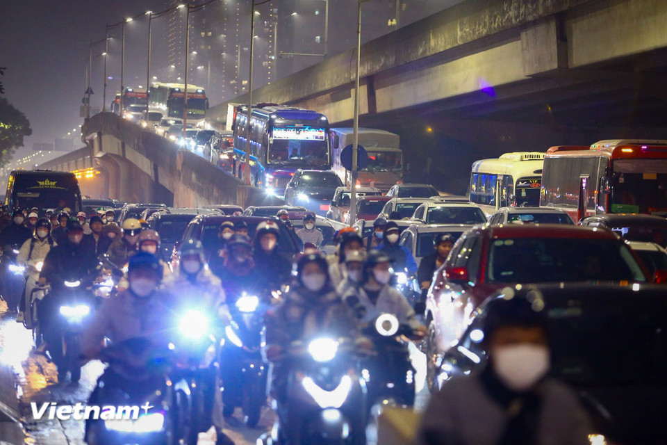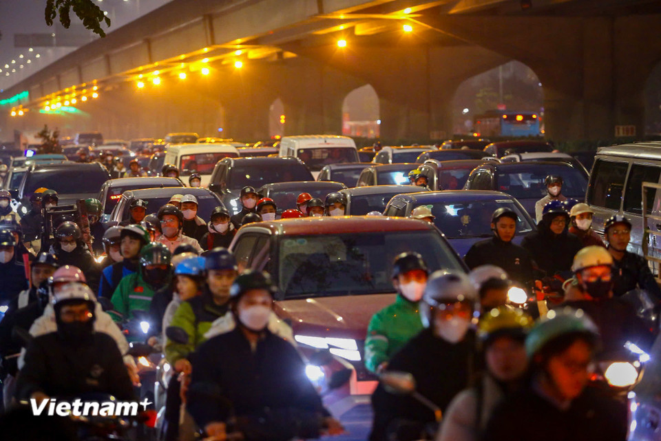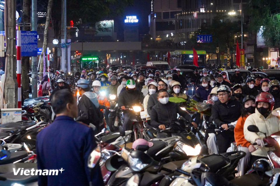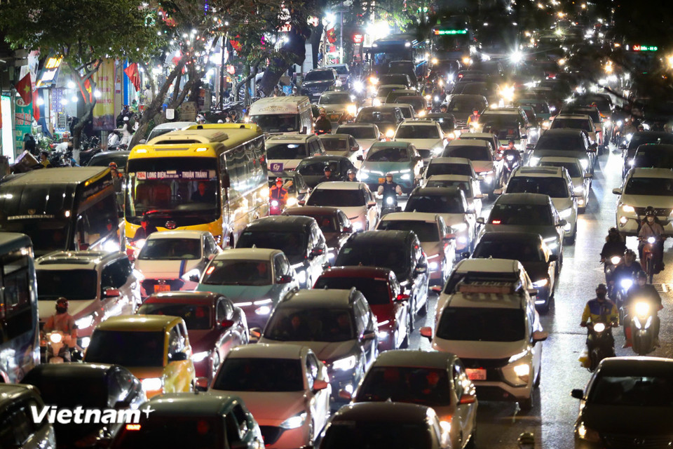 Ban ngày là vậy, đến tối trong thời điểm từ 20-21 giờ ghi nhận trong tối 10/2, tại nhiều tuyến phố vẫn chịu áp lực lớn từ luồng phương tiện di chuyển trên đường. (Ảnh: Hoài Nam/Vietnam+)