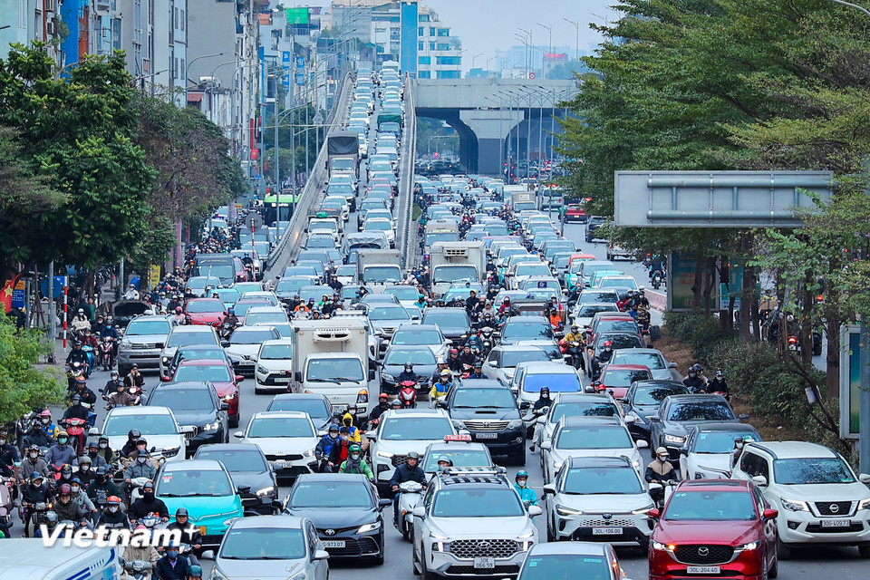 Tại đường Vành đai 3 thường ngày vốn đông đúc trong những ngày này lại càng chật chội hơn. (Ảnh: Hoài Nam/Vietnam+)
