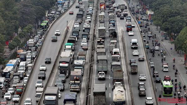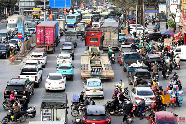 Dòng phương tiện di chuyển chậm theo hướng về cửa ngõ phía Nam của Thủ đô.
