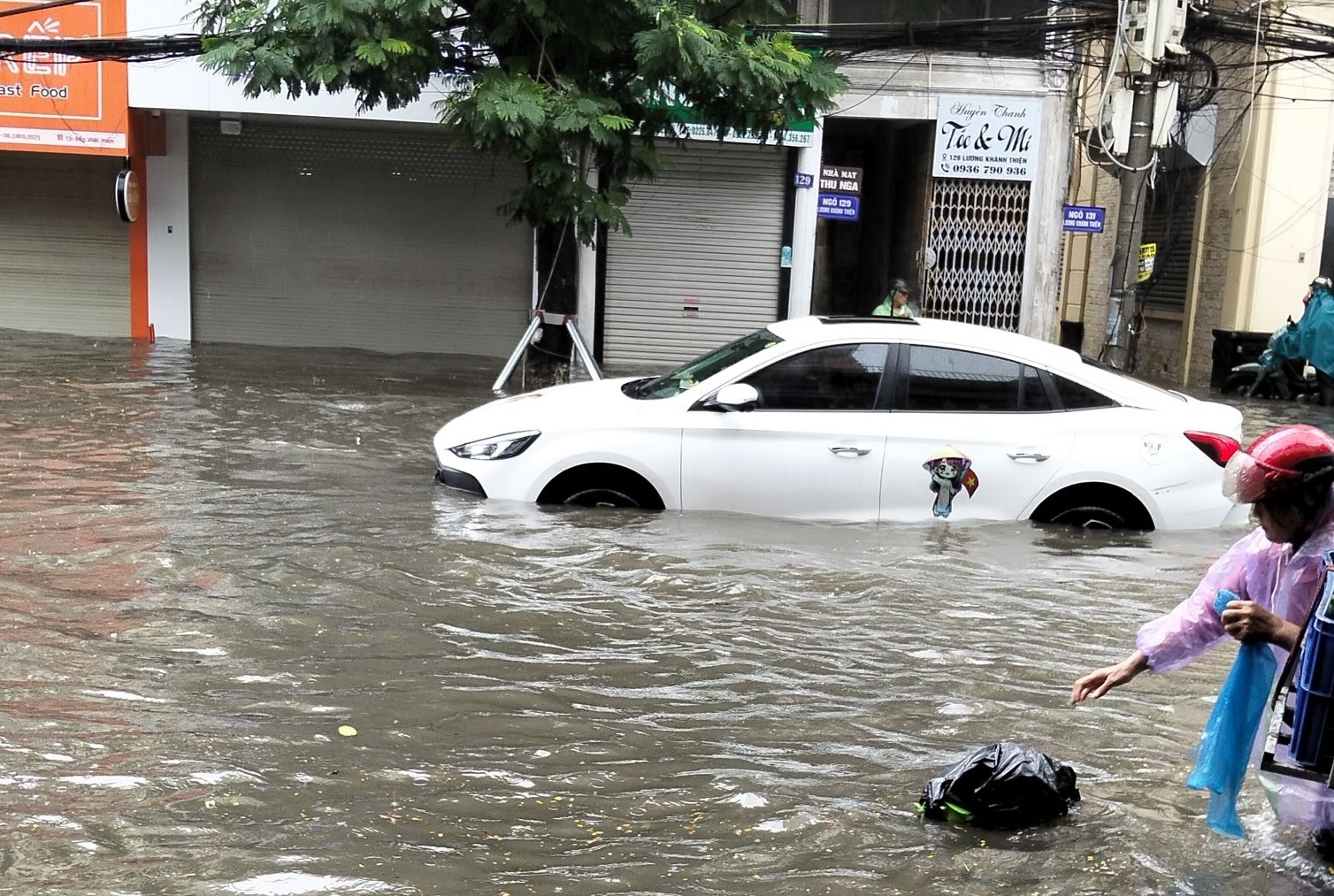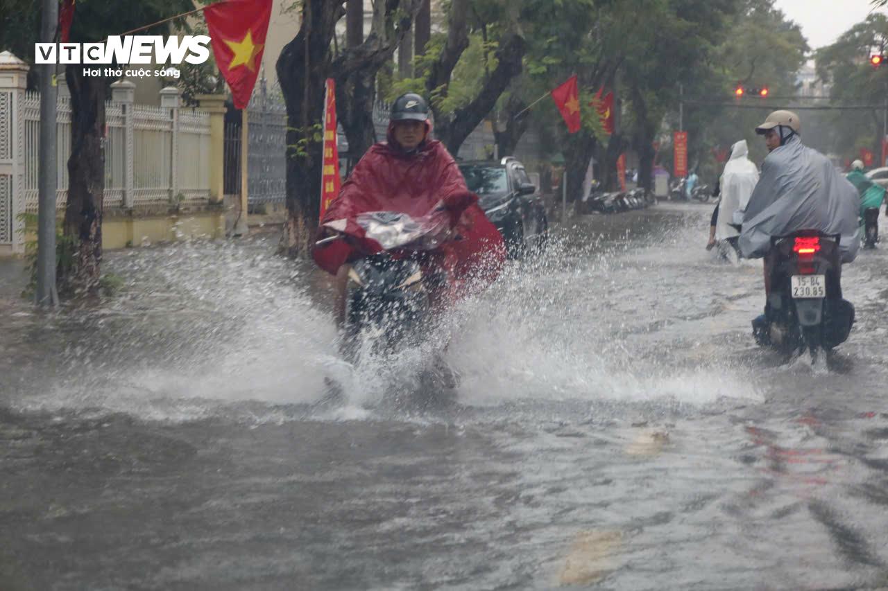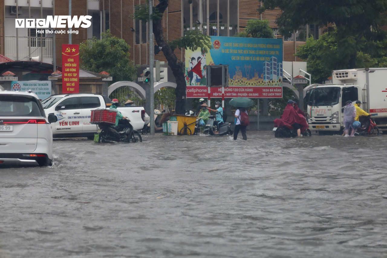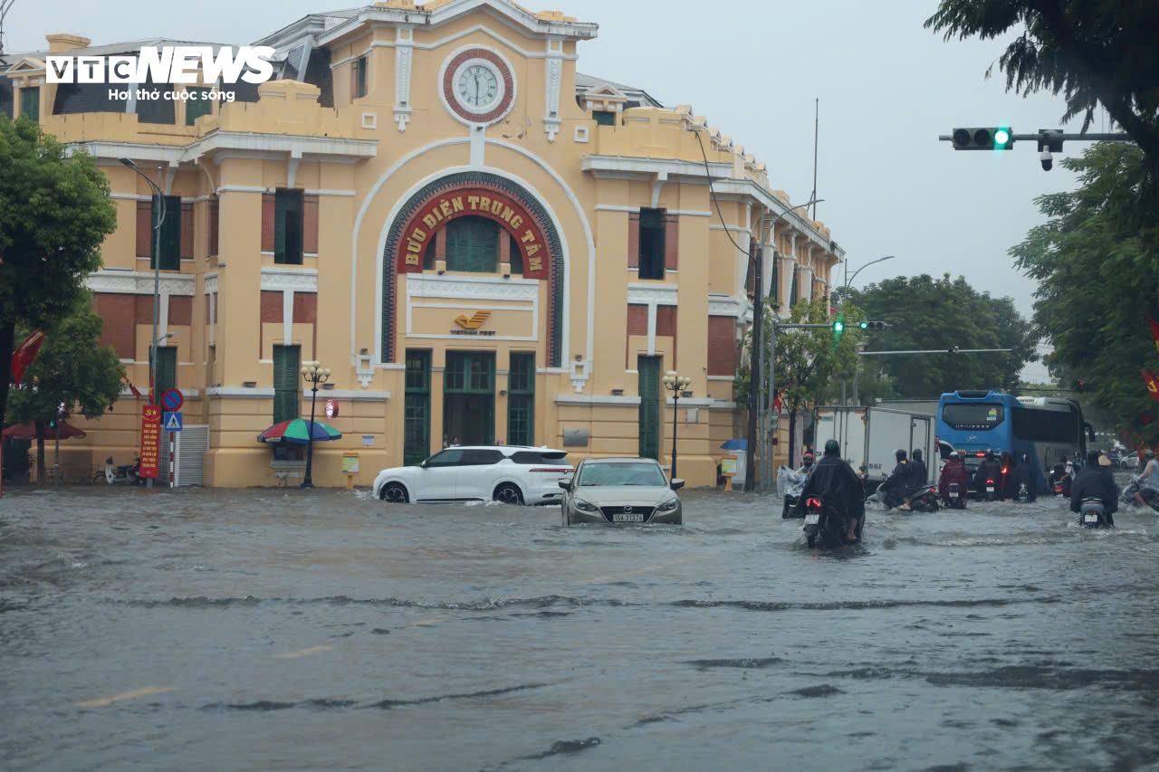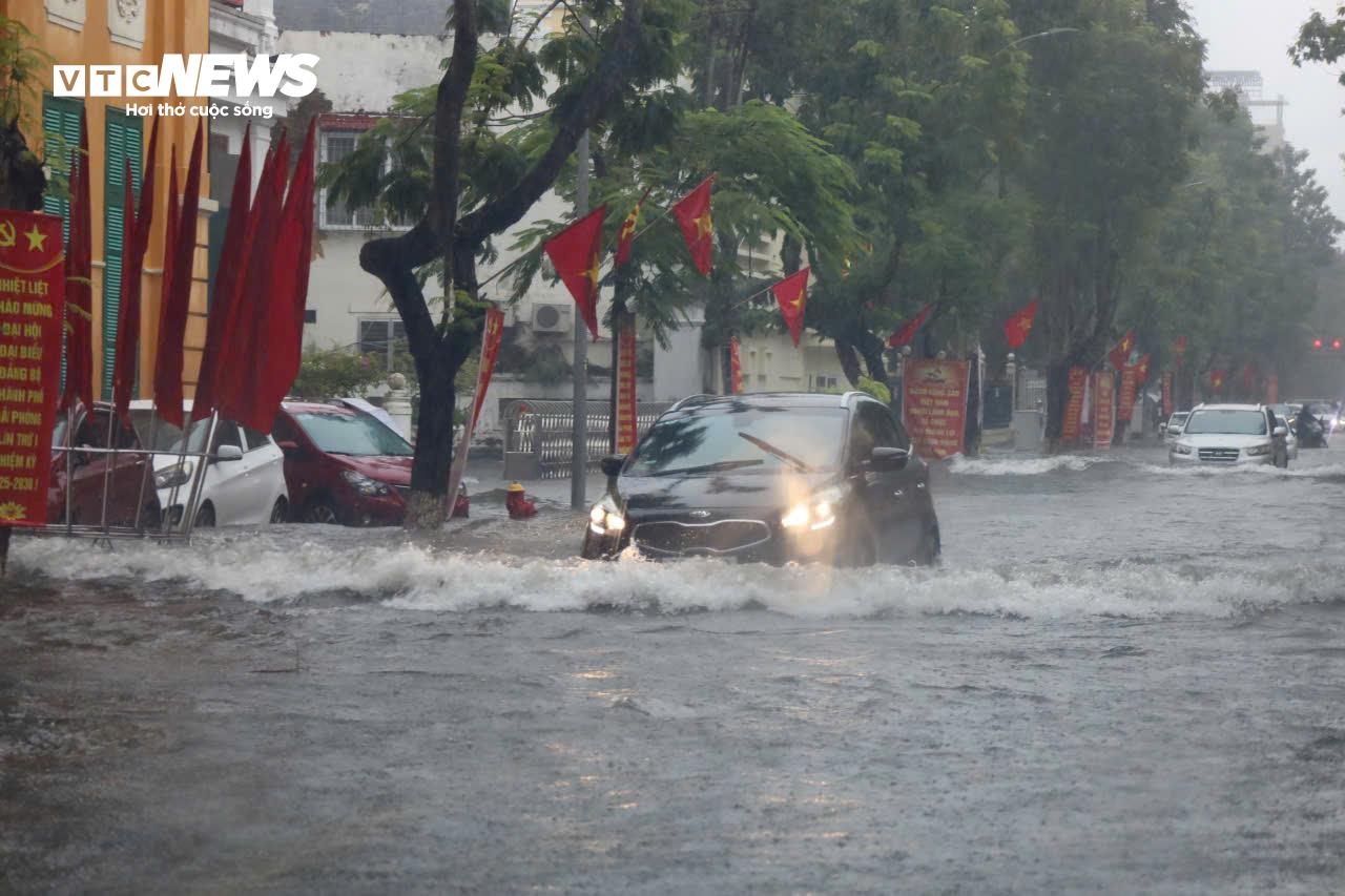 Cơn mưa lớn kéo dài từ rạng sáng đến trưa 14/10 khiến nhiều tuyến phố tại nội thành Hải Phòng ngập sâu. Mưa trên diện rộng kết hợp với nước triều ngoài sông dâng cao gây nên tình trạng ngập lụt cục bộ, có nơi ngập sâu đến gần nửa mét.