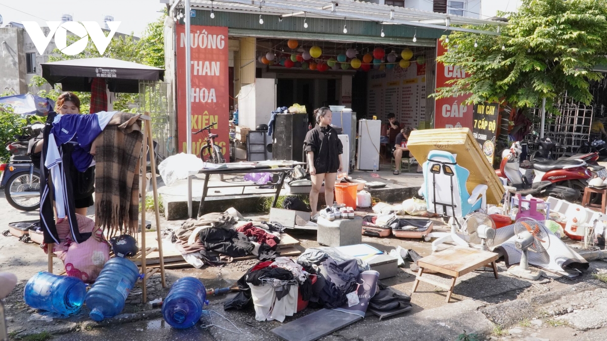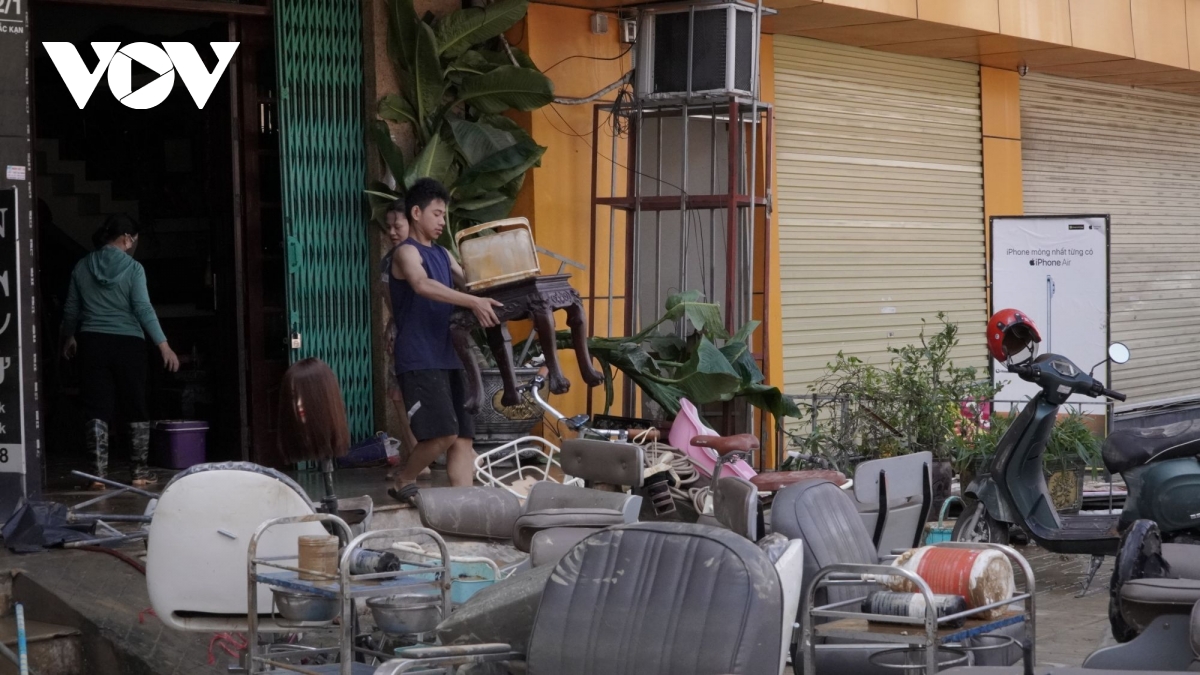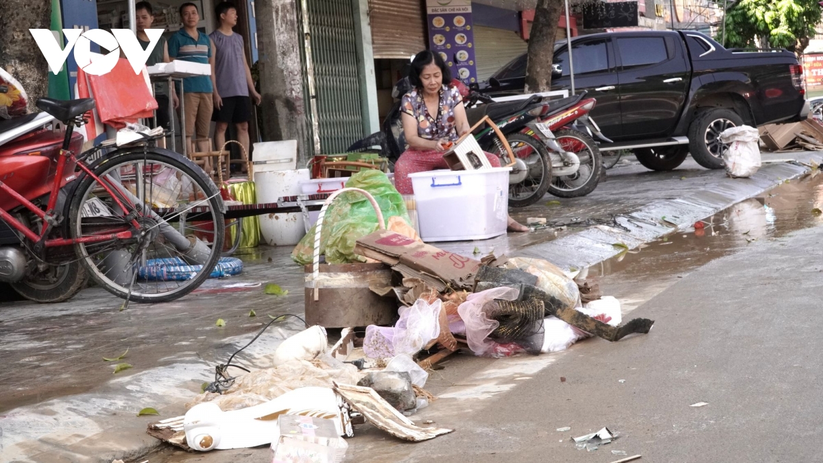 Người dân trên đường Bắc Kạn tranh thủ dọn dẹp, cứu những đồ đạc còn sót lại có thể dùng được sau khi nước rút.