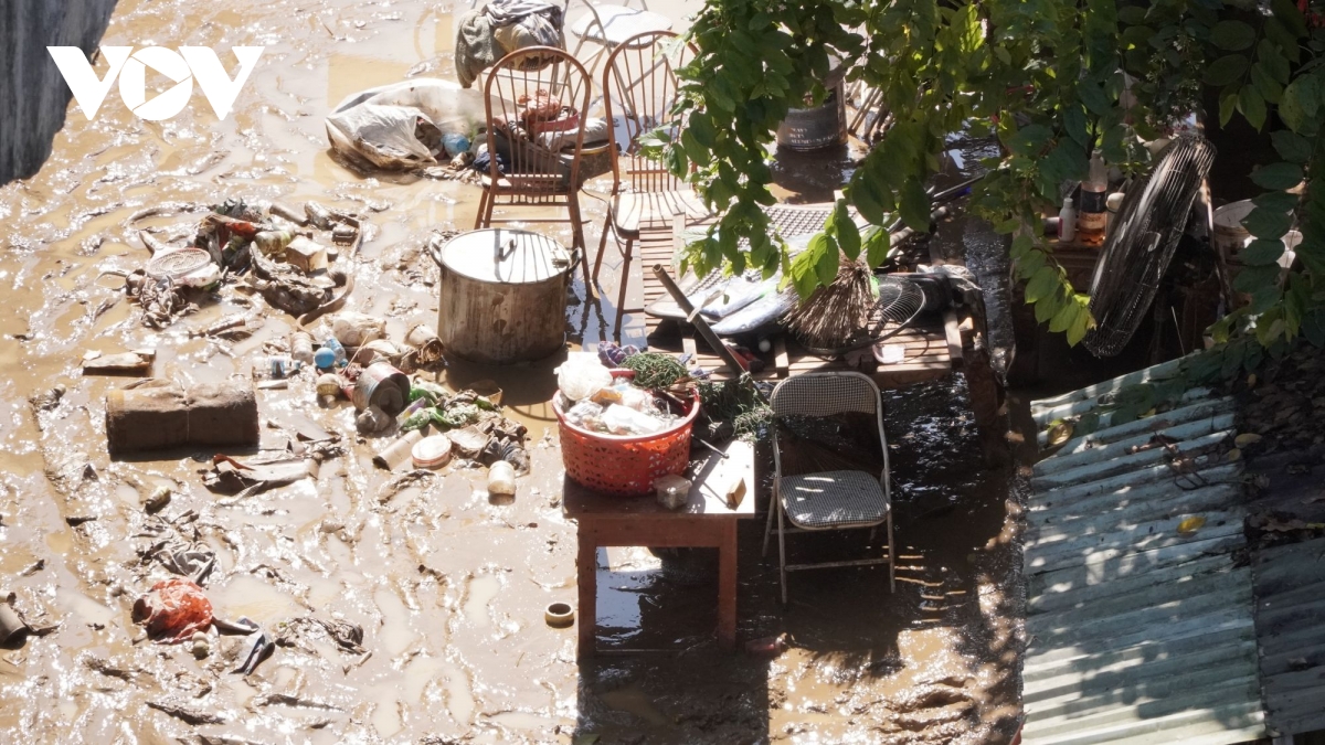 Khung cảnh tan hoang, bùn đất, rác rưới bủa vây nhà cửa và các tuyến đường.
