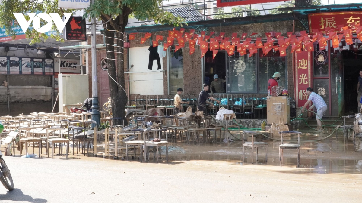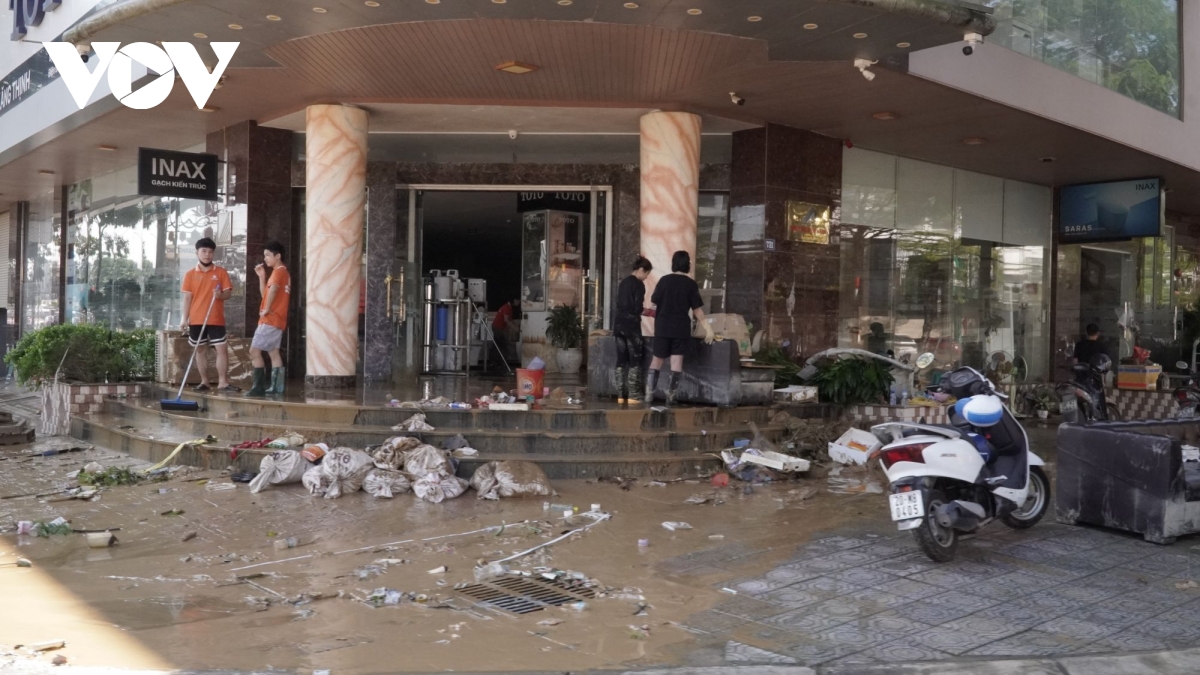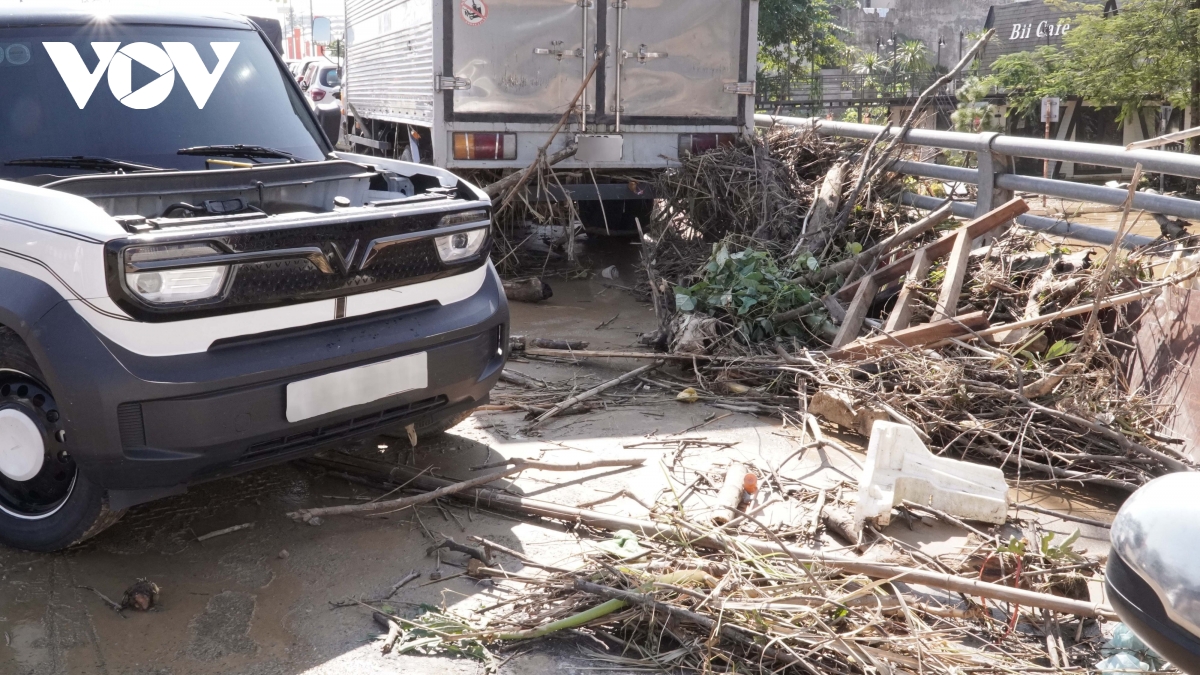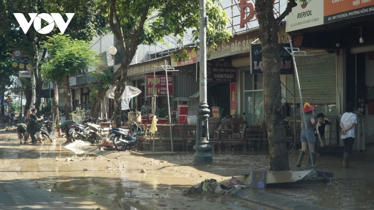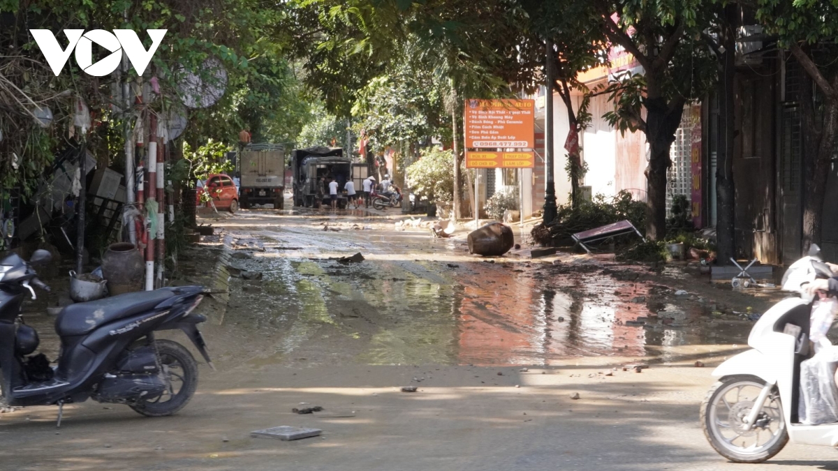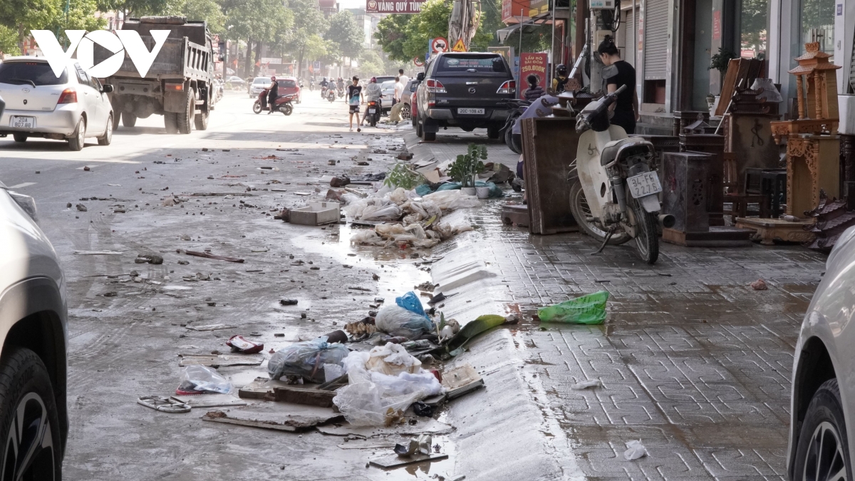 Trên các tuyến phố, bùn đất và rác rưởi còn tồn đọng khá nhiều.