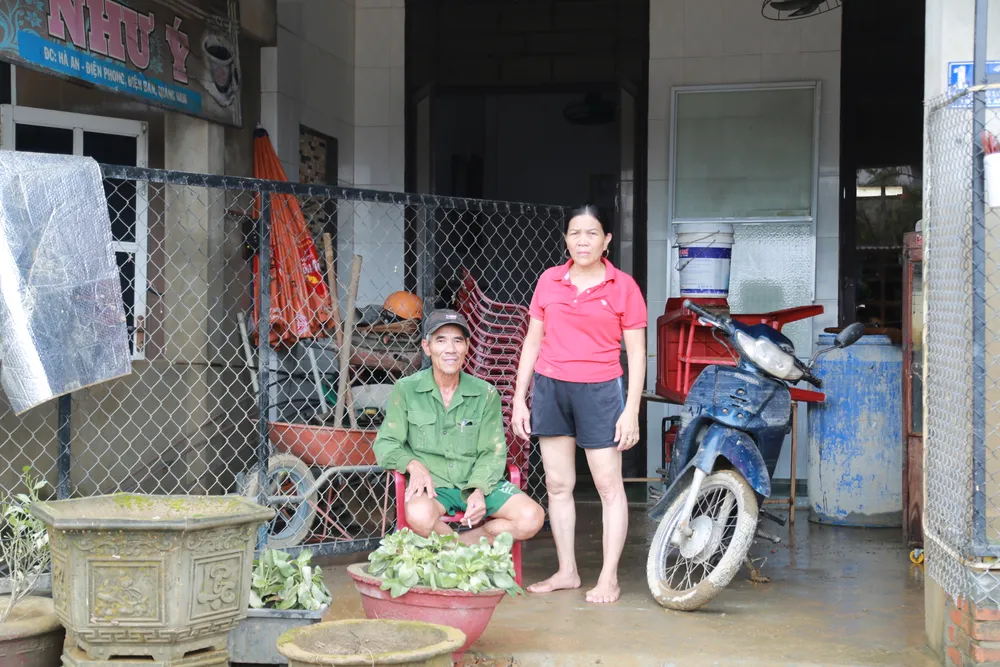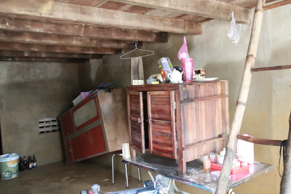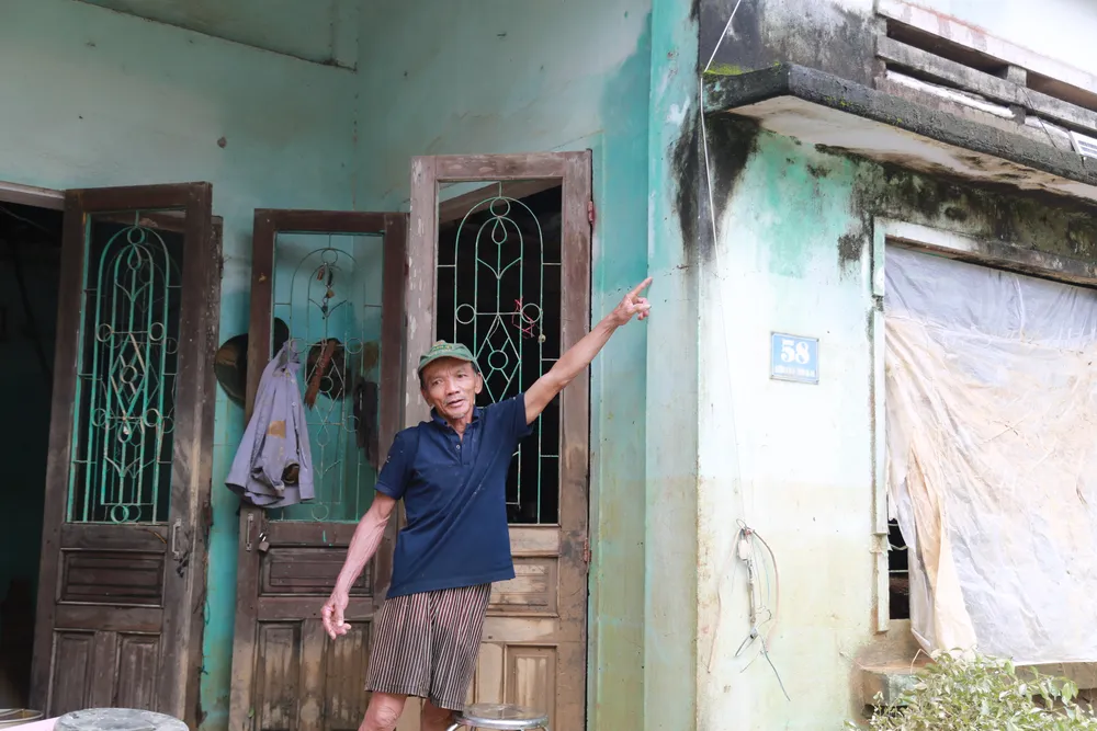 Chồng bà Diệp, ông Trịnh Duy Quỡn (67 tuổi, xã Gò Nổi) cho biết bàn, ghế, tủ... phải để bên dưới, chấp nhận ngâm nước. Vợ chồng ông cùng mẹ già trú tránh trên gác lửng xập xệ suốt 5 ngày liền. Ảnh: THANH NHẬT
