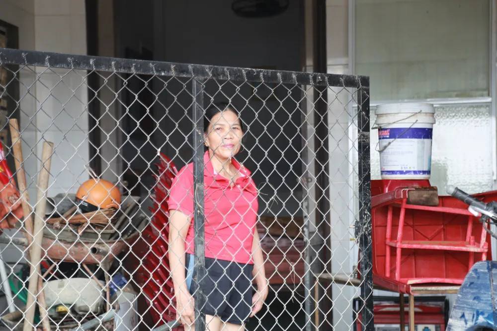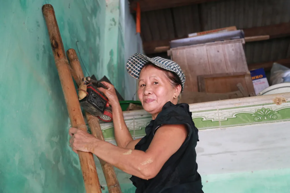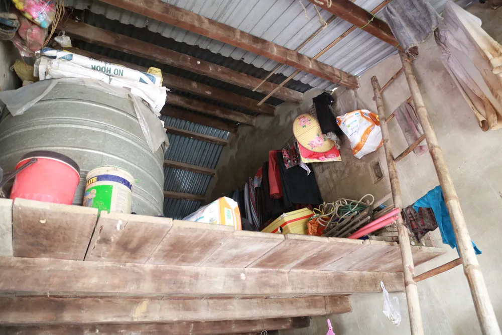 Lũ dâng gần tới gác lửng, bà Huỳnh Thị Diệp (65 tuổi, xã Gò Nổi) đưa hết đồ đạc quan trọng lên cao. Sáng nay, bà bắt đầu dọn dẹp nhà cửa, đưa đồ xuống đất. Ảnh: THANH NHẬT