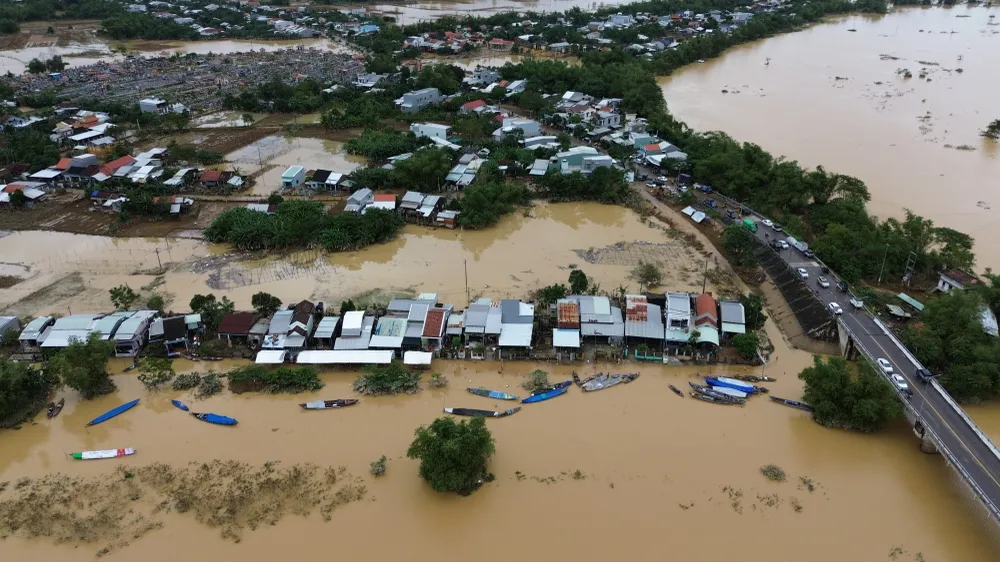 Khung cảnh nhìn từ trên cao nhiều khu dân cư ở xã Gò Nổi ngập trong nước. Ảnh: THANH NHẬT