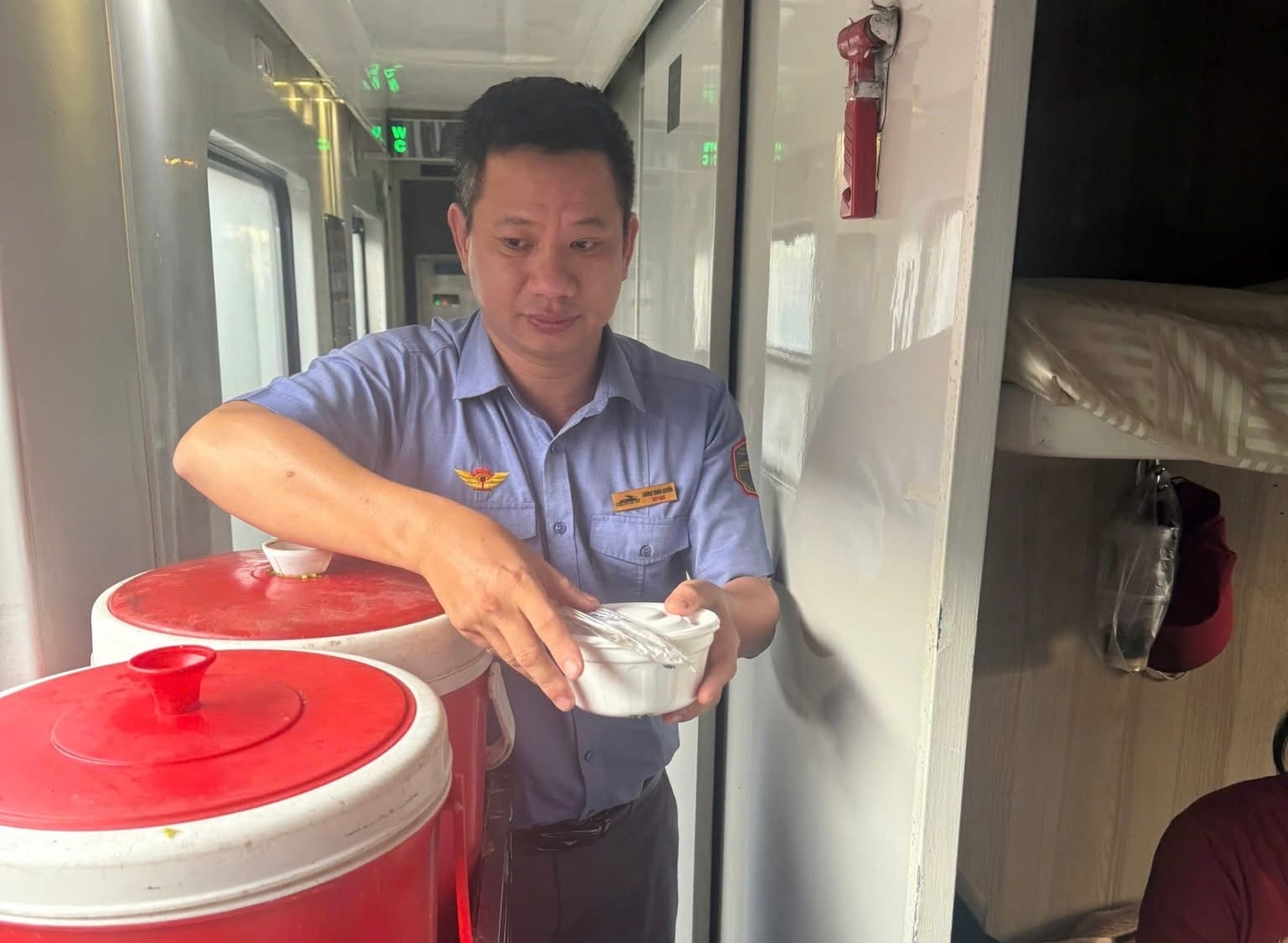 Nhân viên ngành Đường sắt phục vụ bữa ăn cho khách đi tàu. Ảnh: ĐSVN