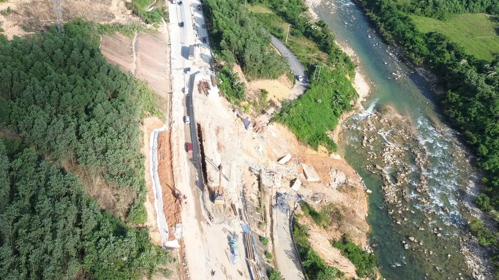 Sạt lở lớn từ cao tốc La Sơn - Hòa Liên bên trên cuốn theo một đoạn tuyến đường tỉnh 601 bên dưới xuống sông. Ảnh: TẤN VIỆT