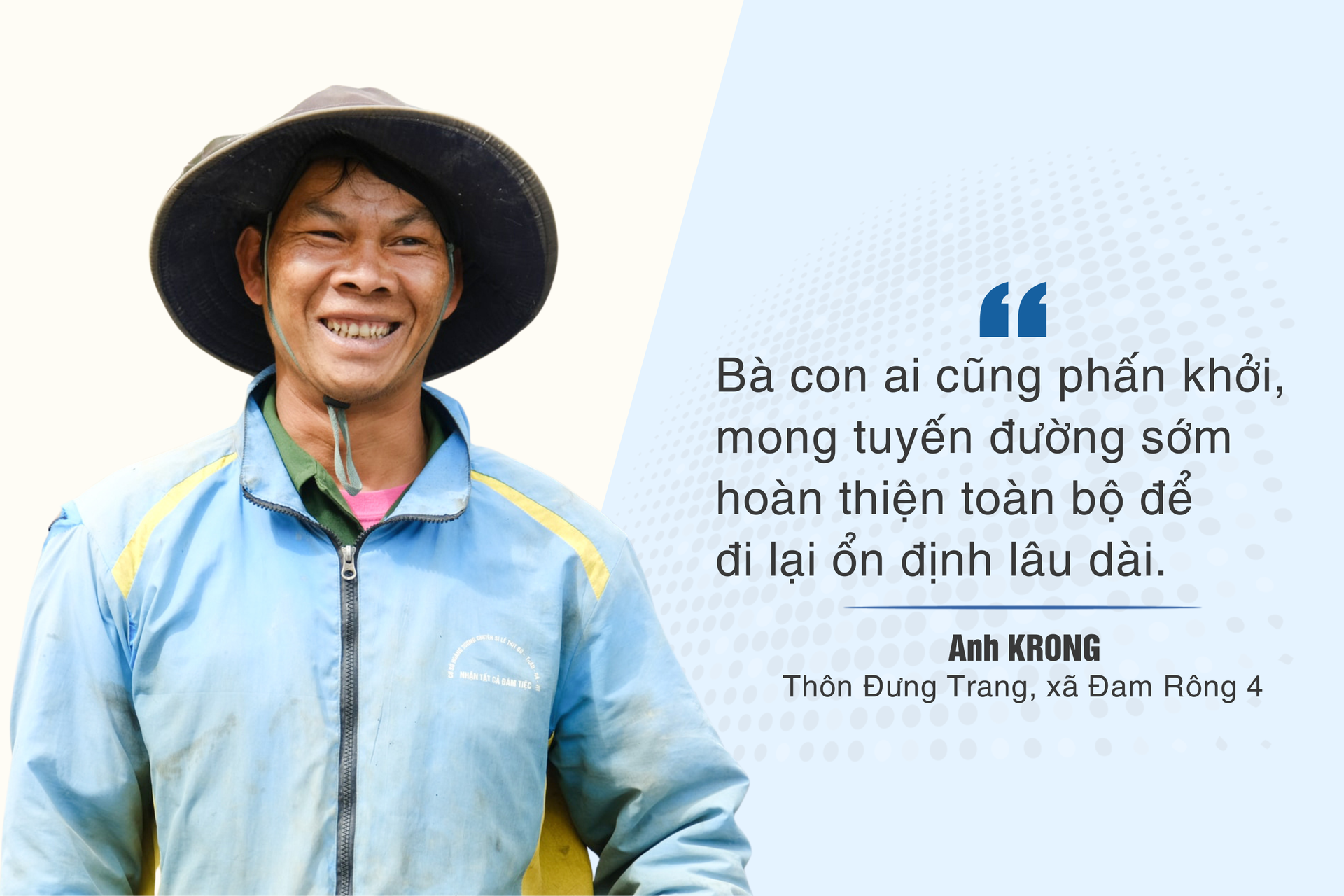 Theo anh Krong, con đường được hoàn thành không chỉ đáp lại niềm mong mỏi của người dân trong vùng. Trước đây, nhiều đoạn đi lại rất vất vả, nhất là mùa mưa thì lầy lội, trơn trượt. Nay đường đã được trải nhựa, rộng và bằng phẳng hơn, cha mẹ đưa con đến trường thuận tiện, việc vận chuyển nông sản cũng dễ dàng.