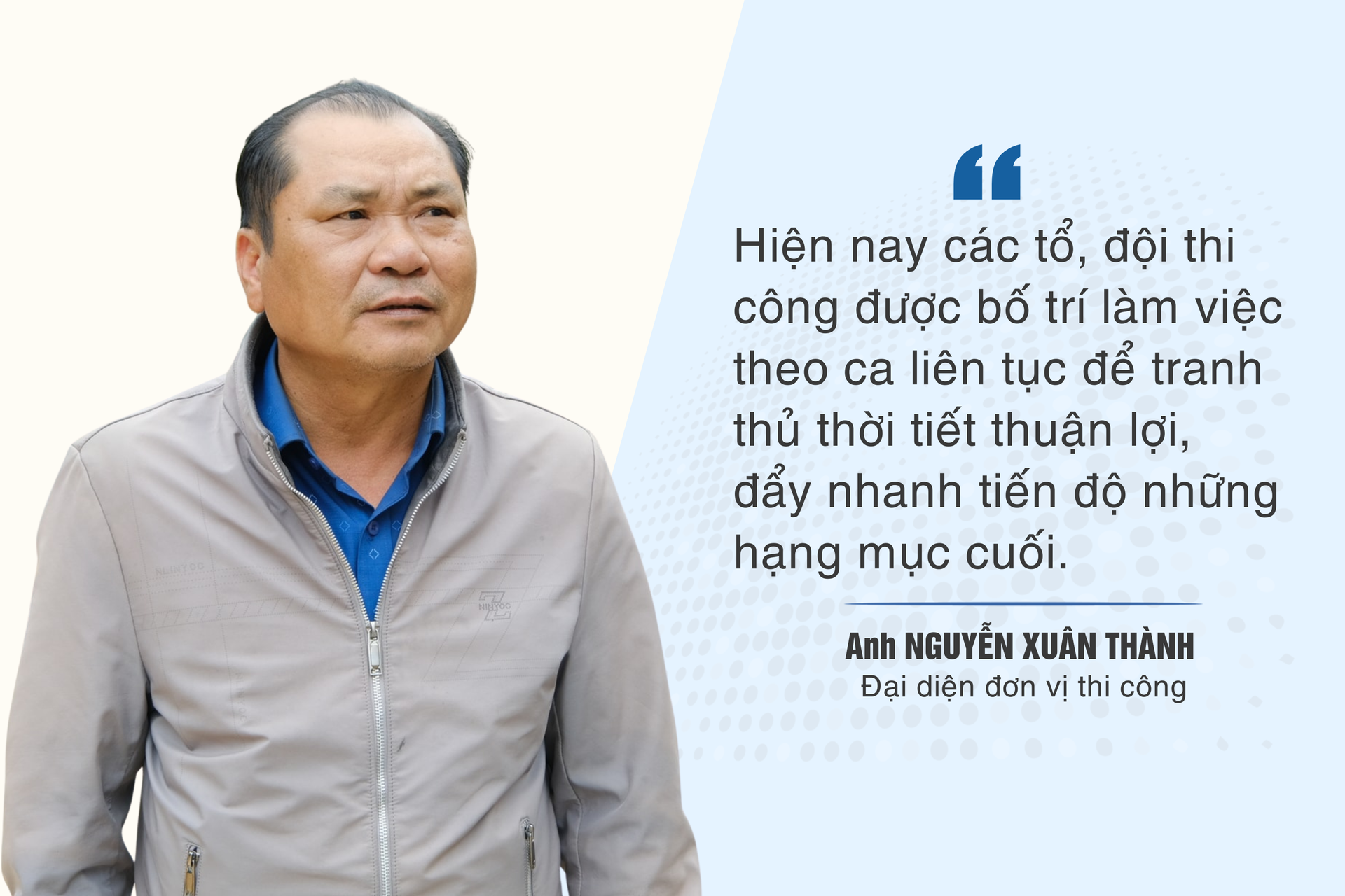 Anh Nguyễn Xuân Thành, đại diện đơn vị thi công cho biết, tiến độ đang được tập trung cao độ ở những đoạn cuối. Đơn vị đang huy động khoảng 100 cán bộ, công nhân cùng nhiều thiết bị cơ giới và 2 dây chuyền thảm nhựa hoạt động dọc tuyến. Chúng tôi tập trung hoàn thiện các đoạn còn lại nhưng vẫn kiểm soát chặt chẽ yêu cầu kỹ thuật, bảo đảm chất lượng công trình khi đưa vào sử dụng.