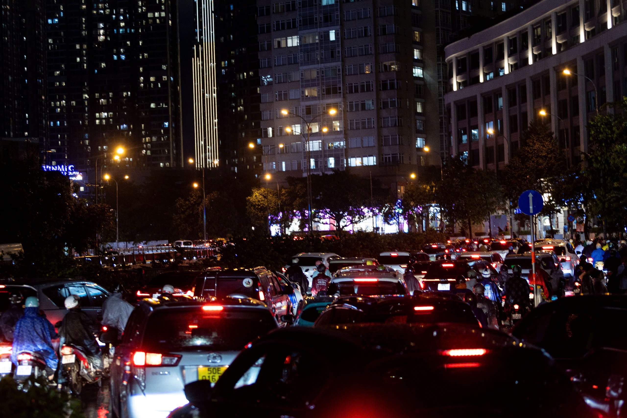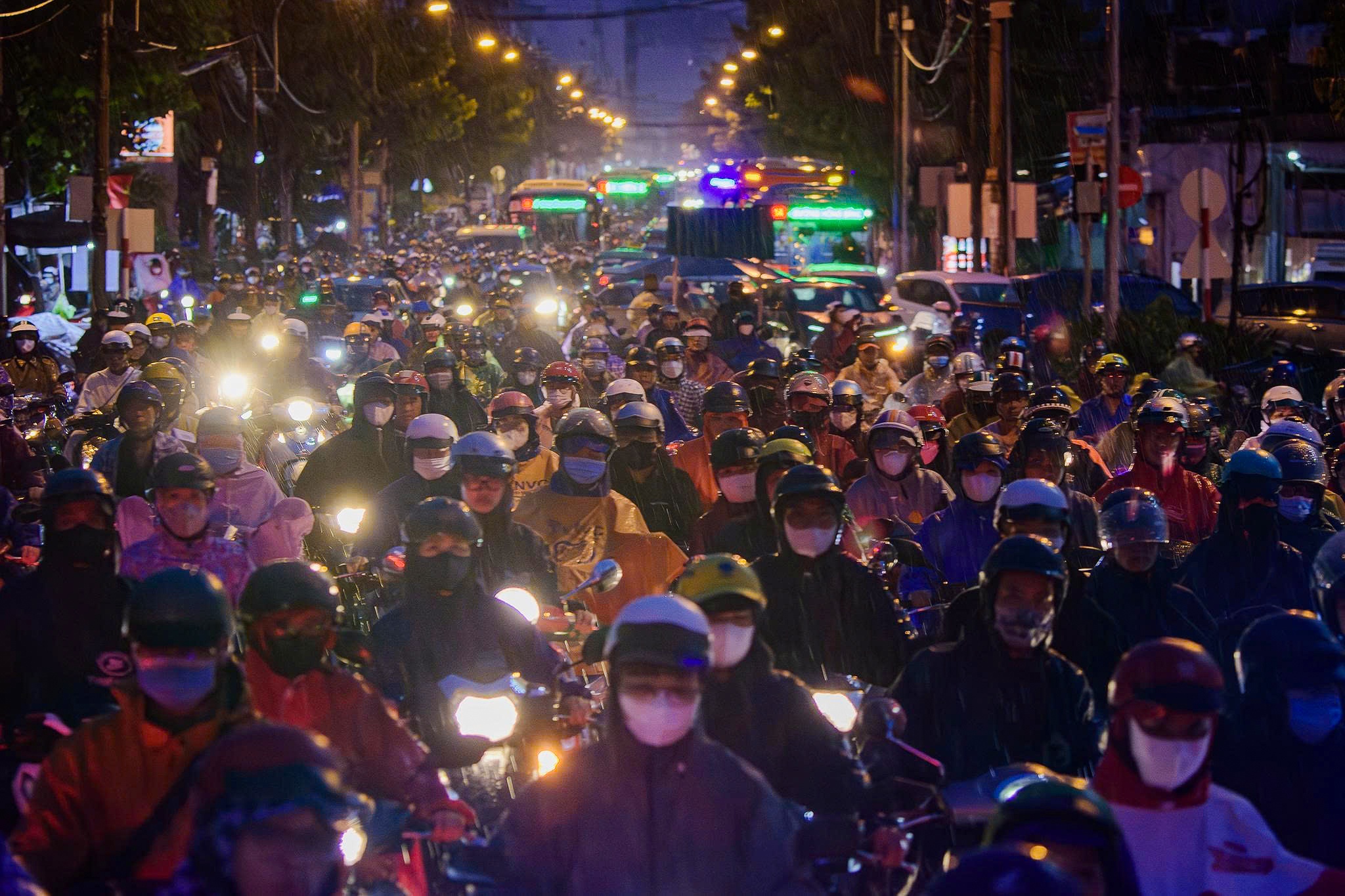 Tuyến đường Điện Biên Phủ (phường Thạnh Mỹ Tây) cũng rơi vào tình trạng tê liệt lúc 20h. Dòng người chen nhau mong nhanh về nhà khiến giao thông hỗn loạn. Ảnh: Khương Nguyễn.