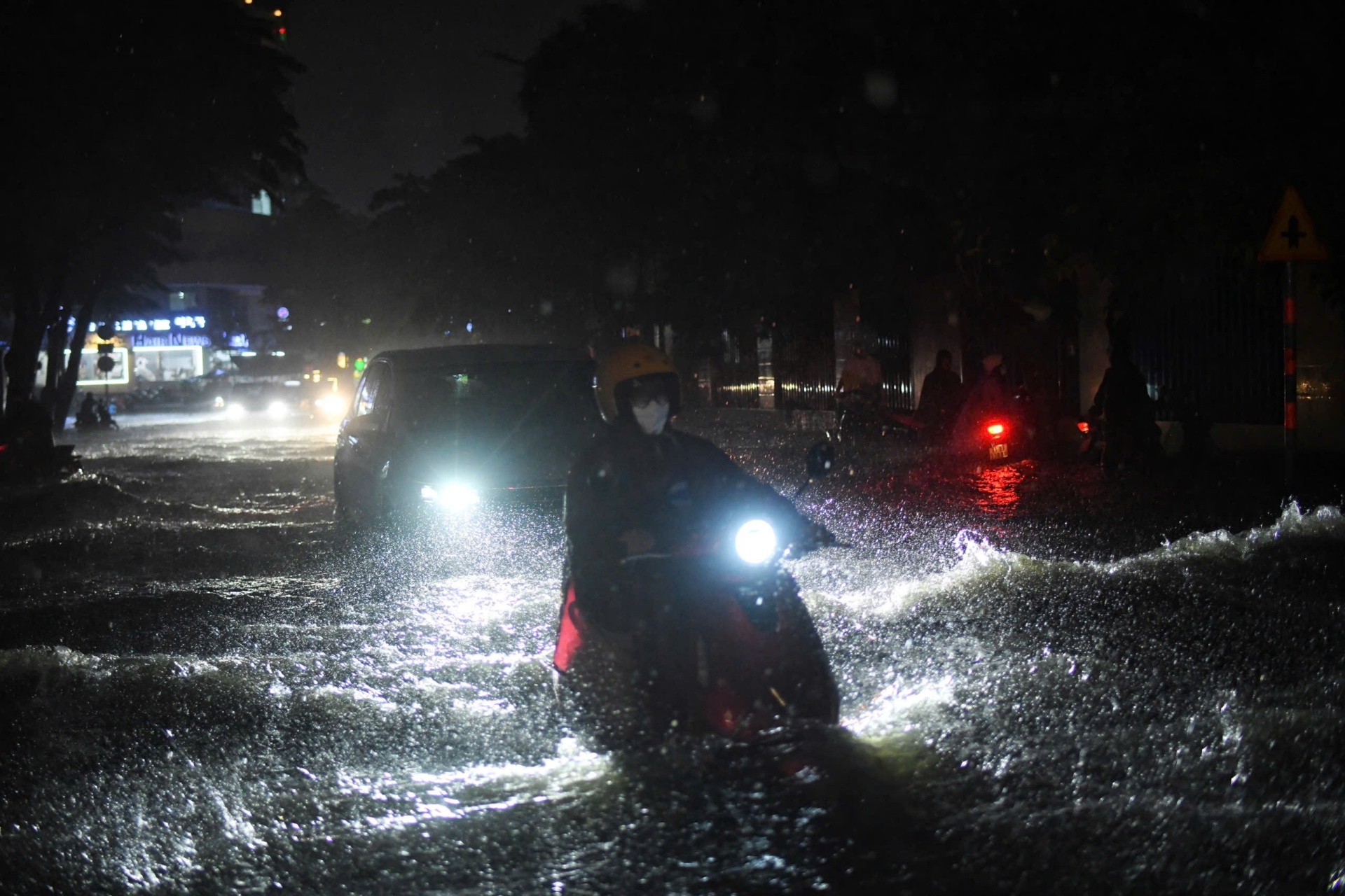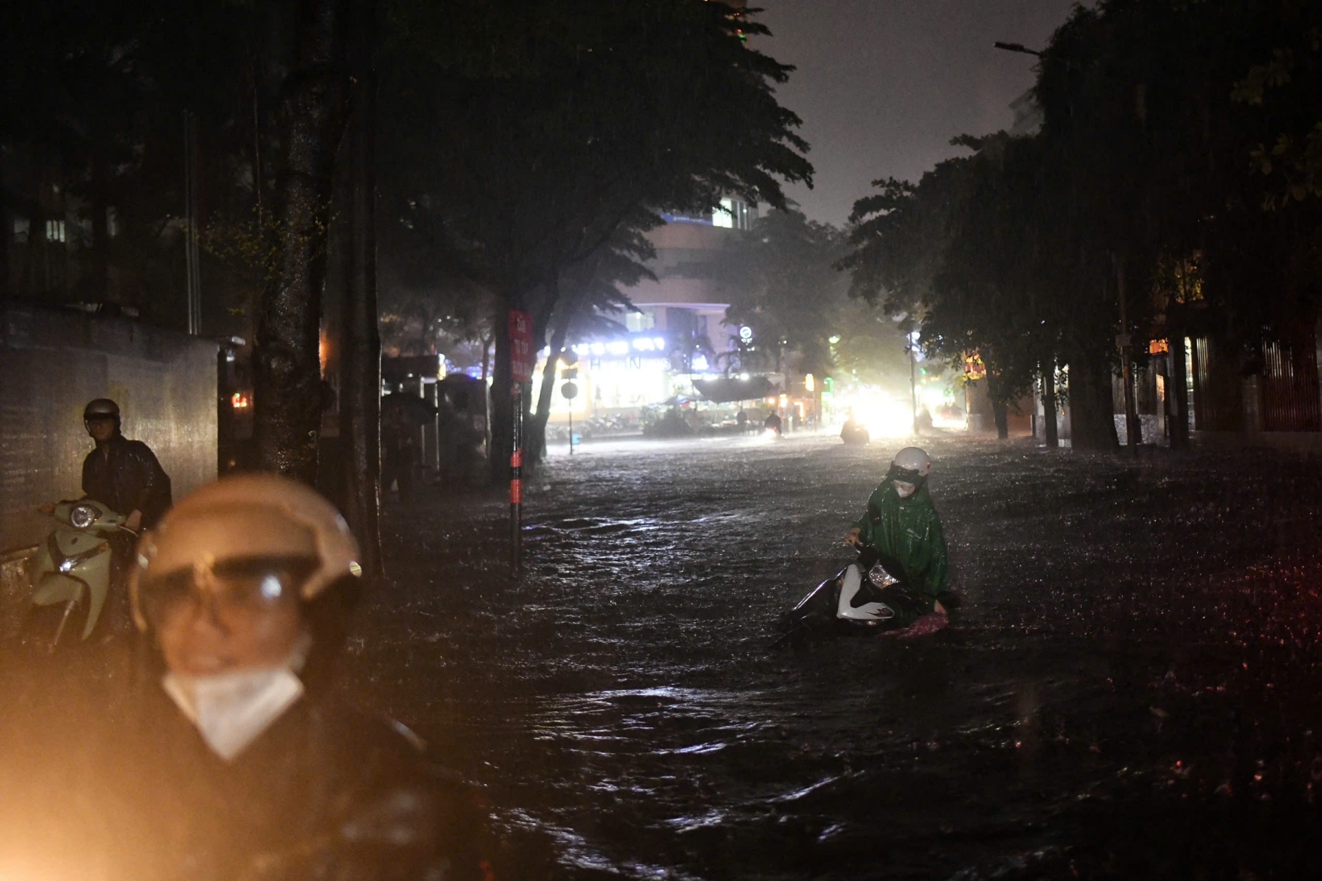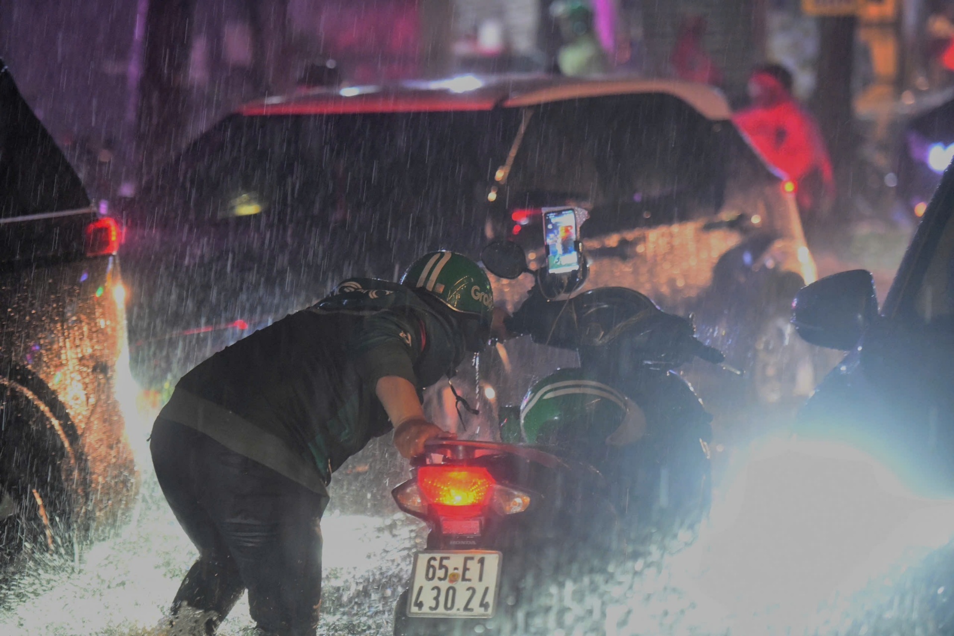 Đường Quốc Hương (phường An Khánh) ngập đến nửa mét từ 16h30. Đến 20h, mưa lớn tiếp tục trút xuống gây khó khăn cho người dân. Một người chật vật dựng xe vì bị ngã khi qua vũng nước ngập. Ảnh: Duy Hiệu.