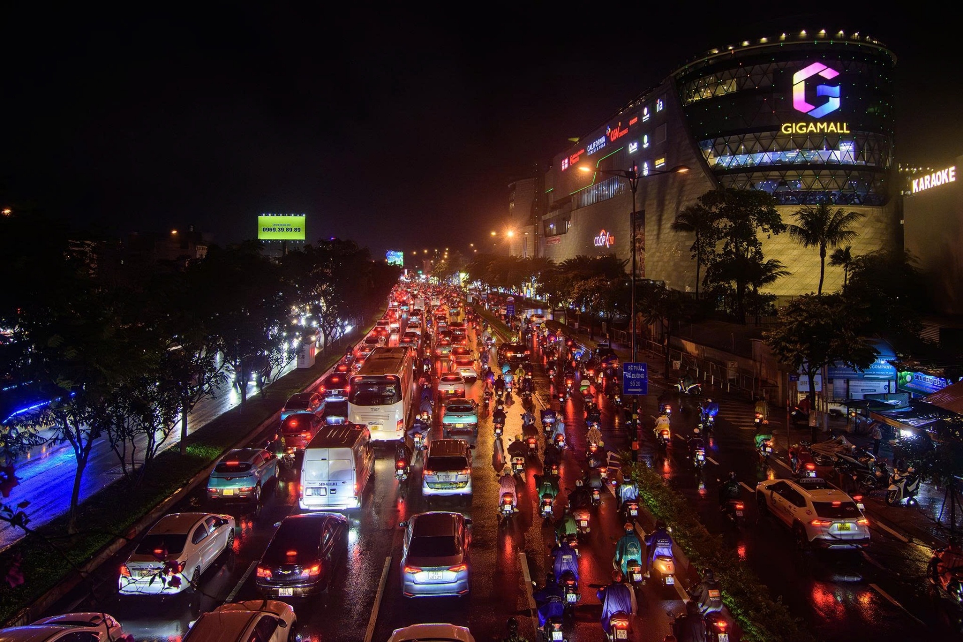 Tối 8/10, TP.HCM xuất hiện mưa lớn trên diện rộng vào giờ tan tầm khiến nhiều tuyến đường kẹt cứng. Từ 17h45, giao thông tại đường Quốc Hương (phường An Khánh), Lê Duẩn, Đồng Khởi (phường Sài Gòn), Nguyễn Bỉnh Khiêm (phường Tân Định), Phạm Văn Đồng (phường Hiệp Bình)... rơi vào cảnh rối loạn. Giao thông tê liệt, người dân mất khoảng 20 phút mới nhích được 1 km. Ảnh: Hoài Bảo.