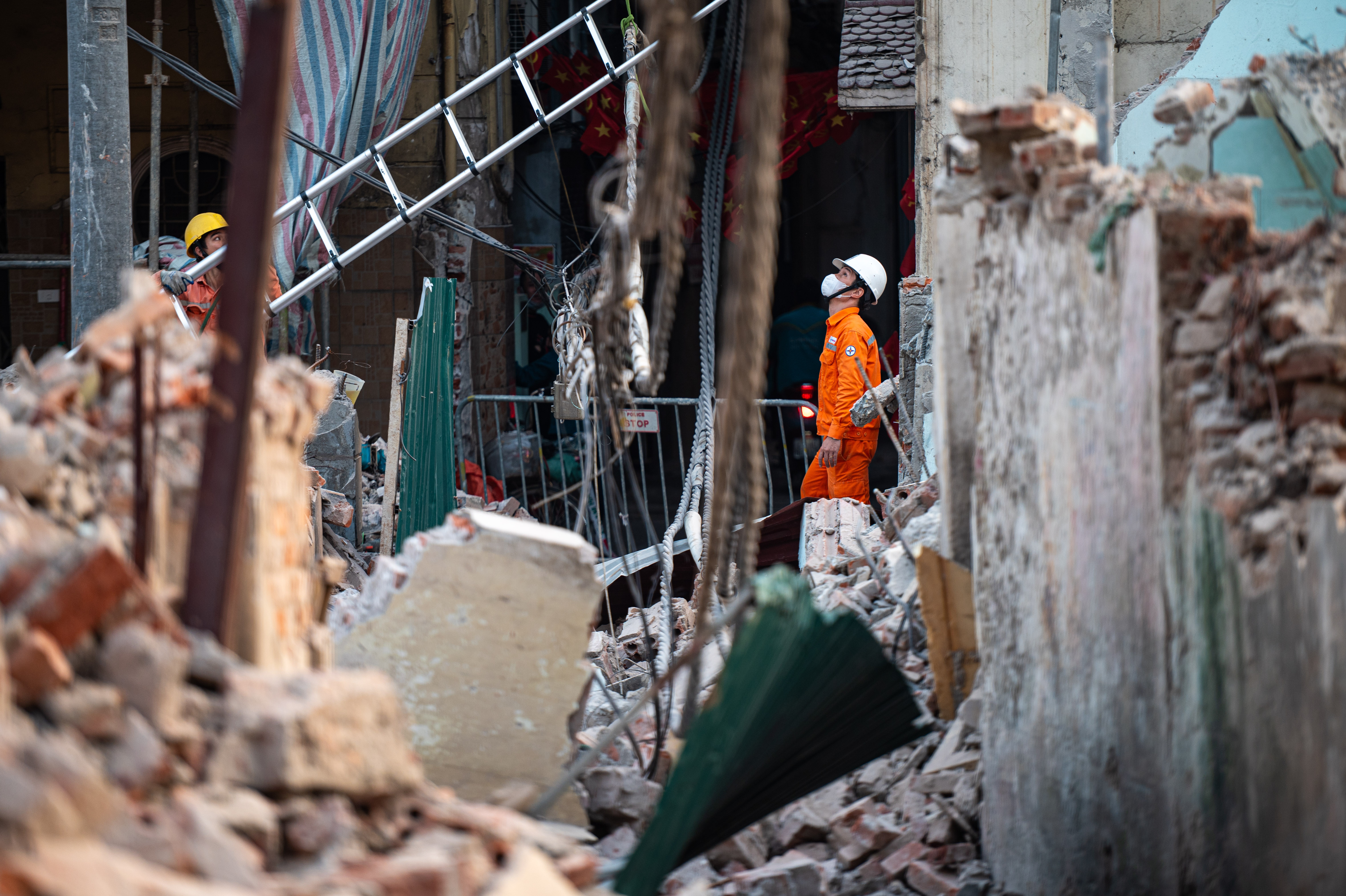 Công nhân điện lực Hà Nội có mặt để thu hồi dây dẫn, công tơ và tháo dỡ hệ thống điện nhằm đảm bảo an toàn trước khi các phương tiện thi công tiếp tục phá dỡ.