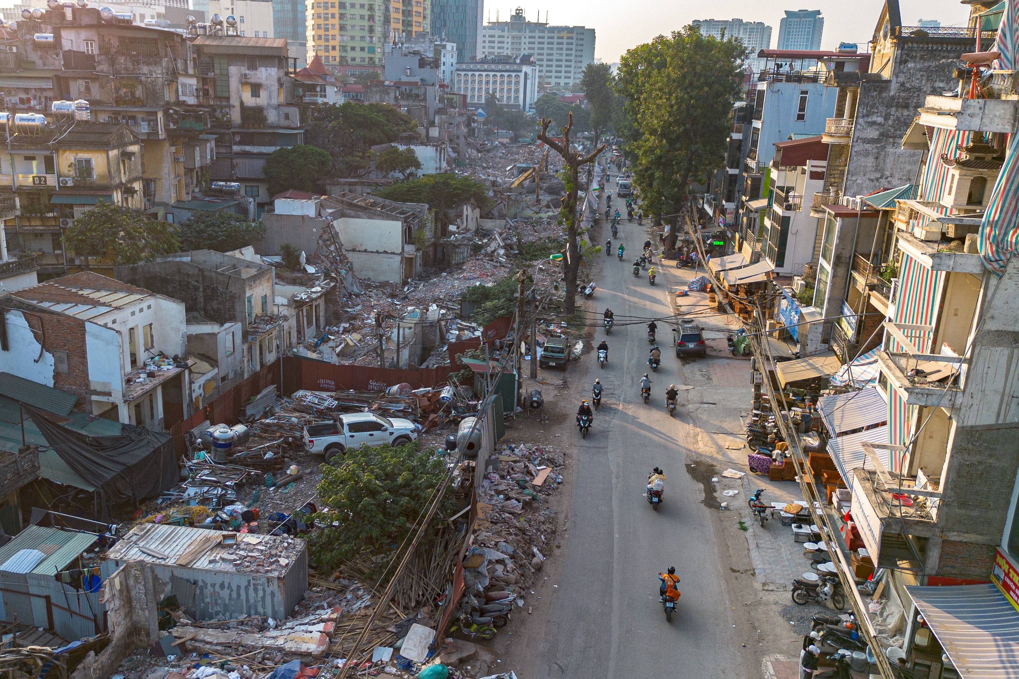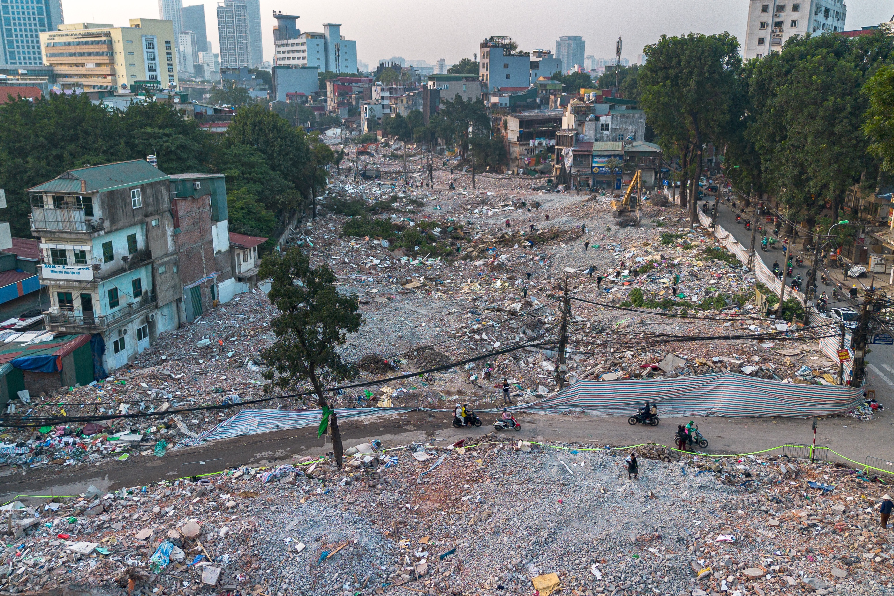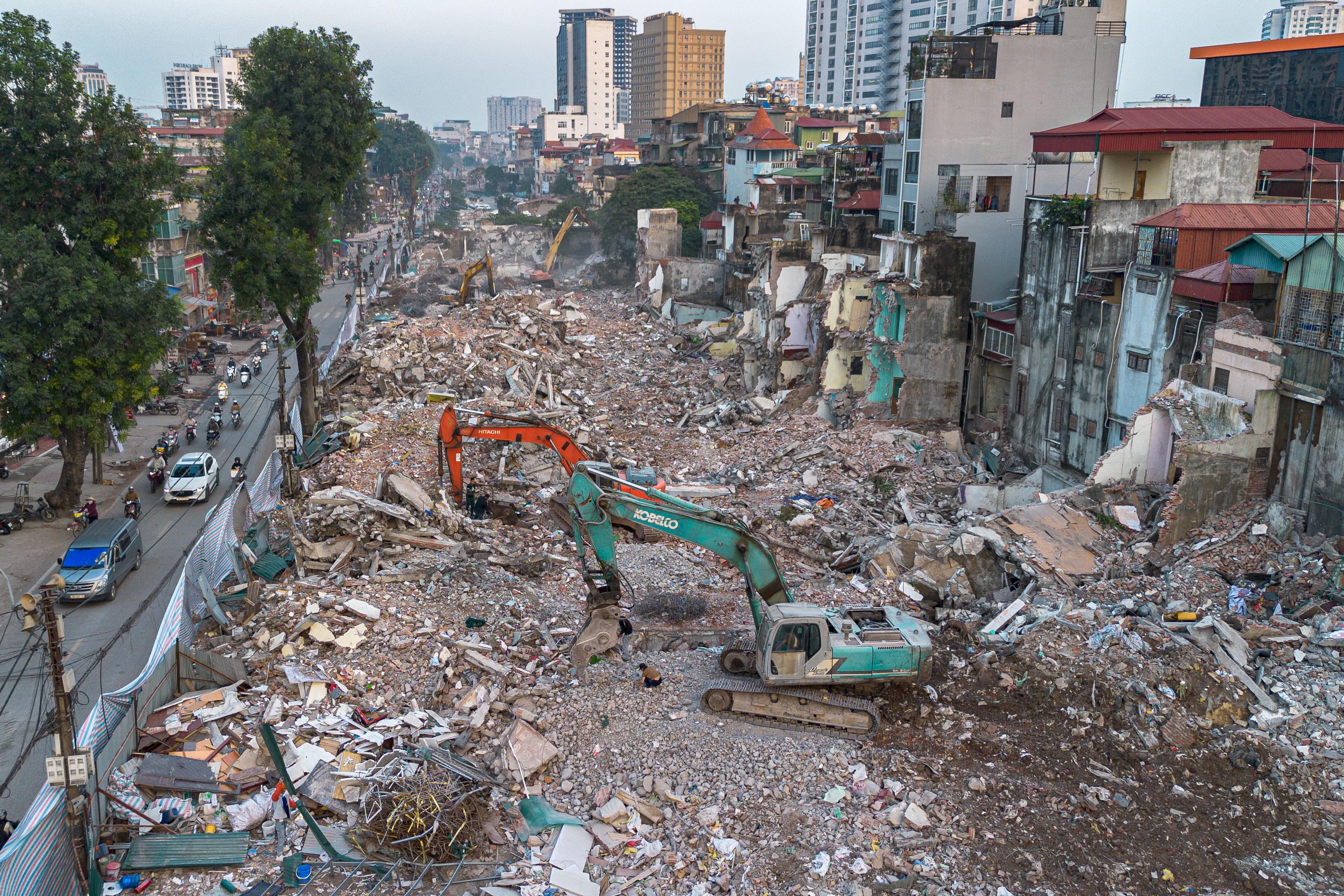 Theo Ban Quản lý dự án, tổng diện tích đất thu hồi của dự án là 153.341 m2, liên quan đến 1.983 hộ dân, nằm trên địa bàn 3 phường Ô Chợ Dừa, Láng và Giảng Võ. Sau khi các công trình được tháo dỡ, phần mặt bằng rộng lớn chạy dọc tuyến dự án dần lộ diện. Hình ảnh trên cao tại khu vực trước cổng bệnh viện Nhi Trung ương chiều 15/12.