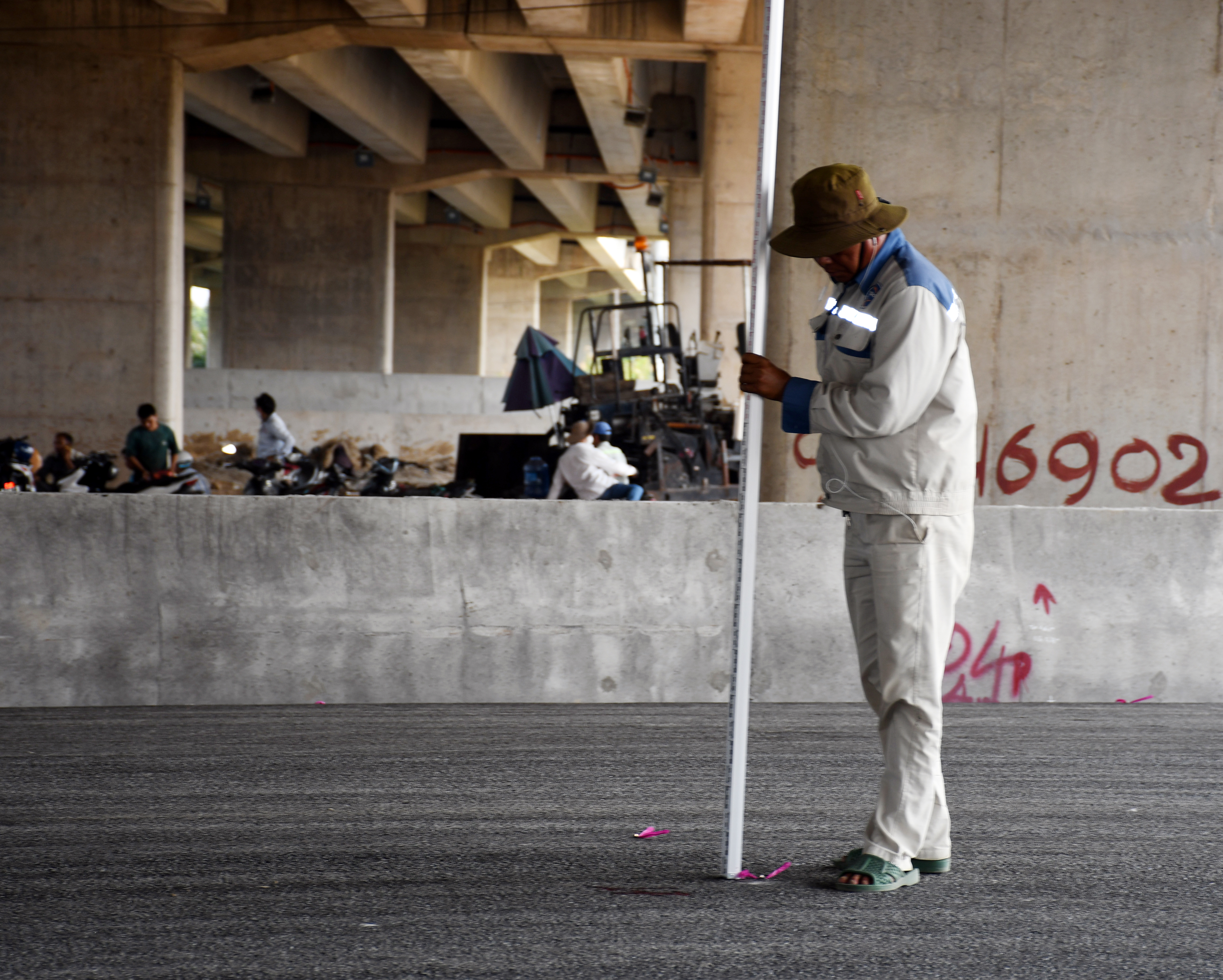 Xe ủi đang thảm nhựa đoạn Vành đai 3 phía dưới cầu cạn TPHCM - Trung Lương