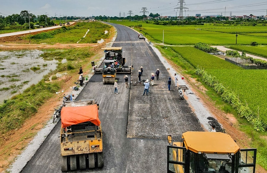 Thi công thảm nhựa đường song hành Dự án đầu tư xây dựng đường Vành đai 4 - Vùng Thủ đô Hà Nội đoạn qua huyện Sóc Sơn (cũ). Ảnh: Trung Nguyên