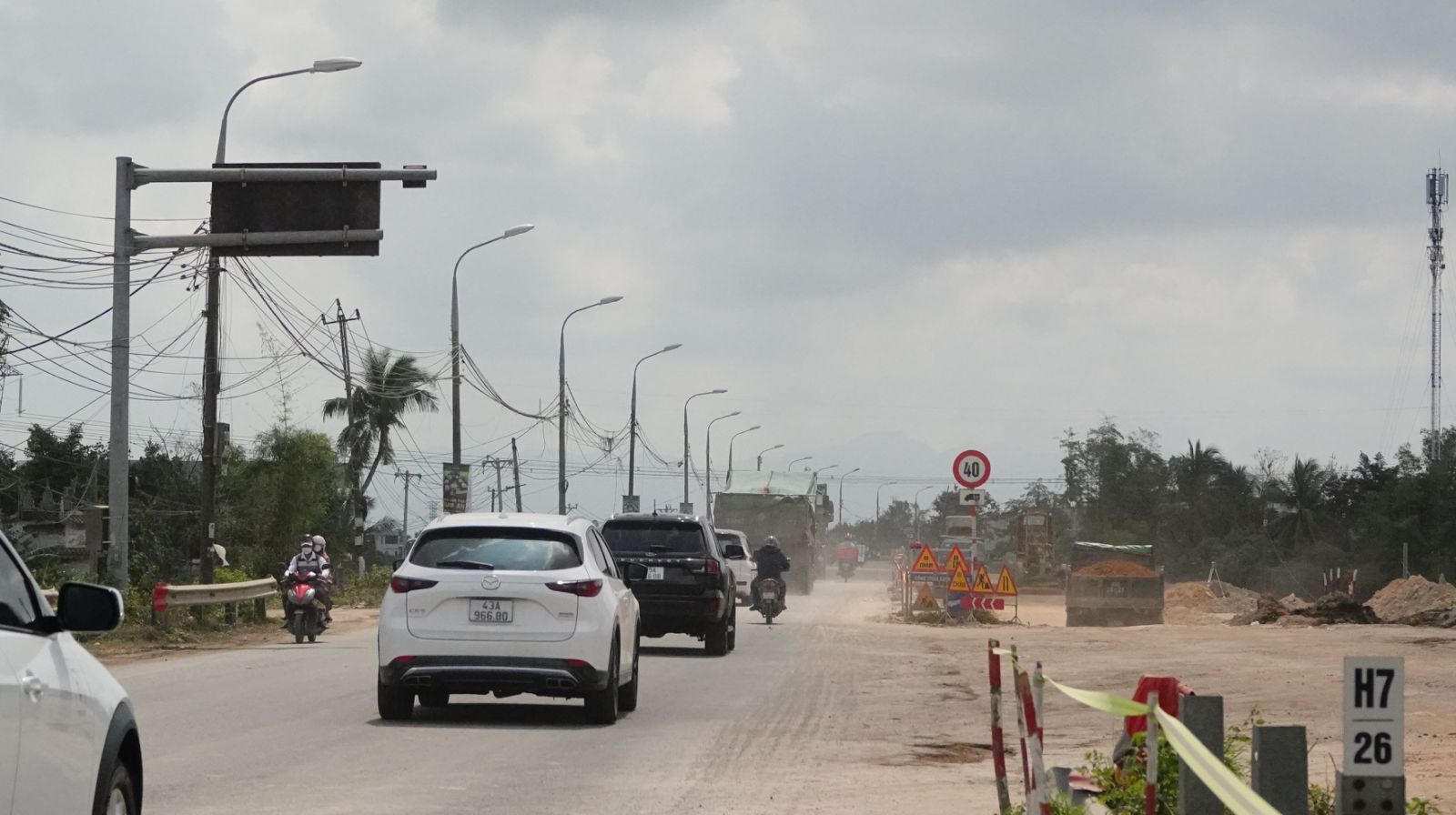 Quốc lộ 14B qua địa phận TP Đà Nẵng, đoạn giáp công trình thi công bụi mù mịt. Ảnh: XUÂN QUỲNH