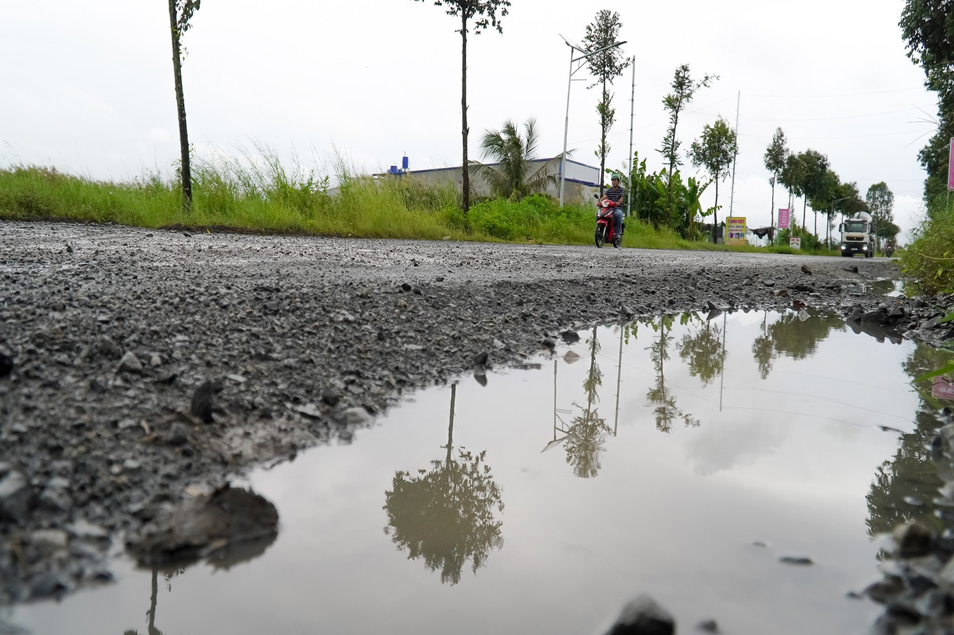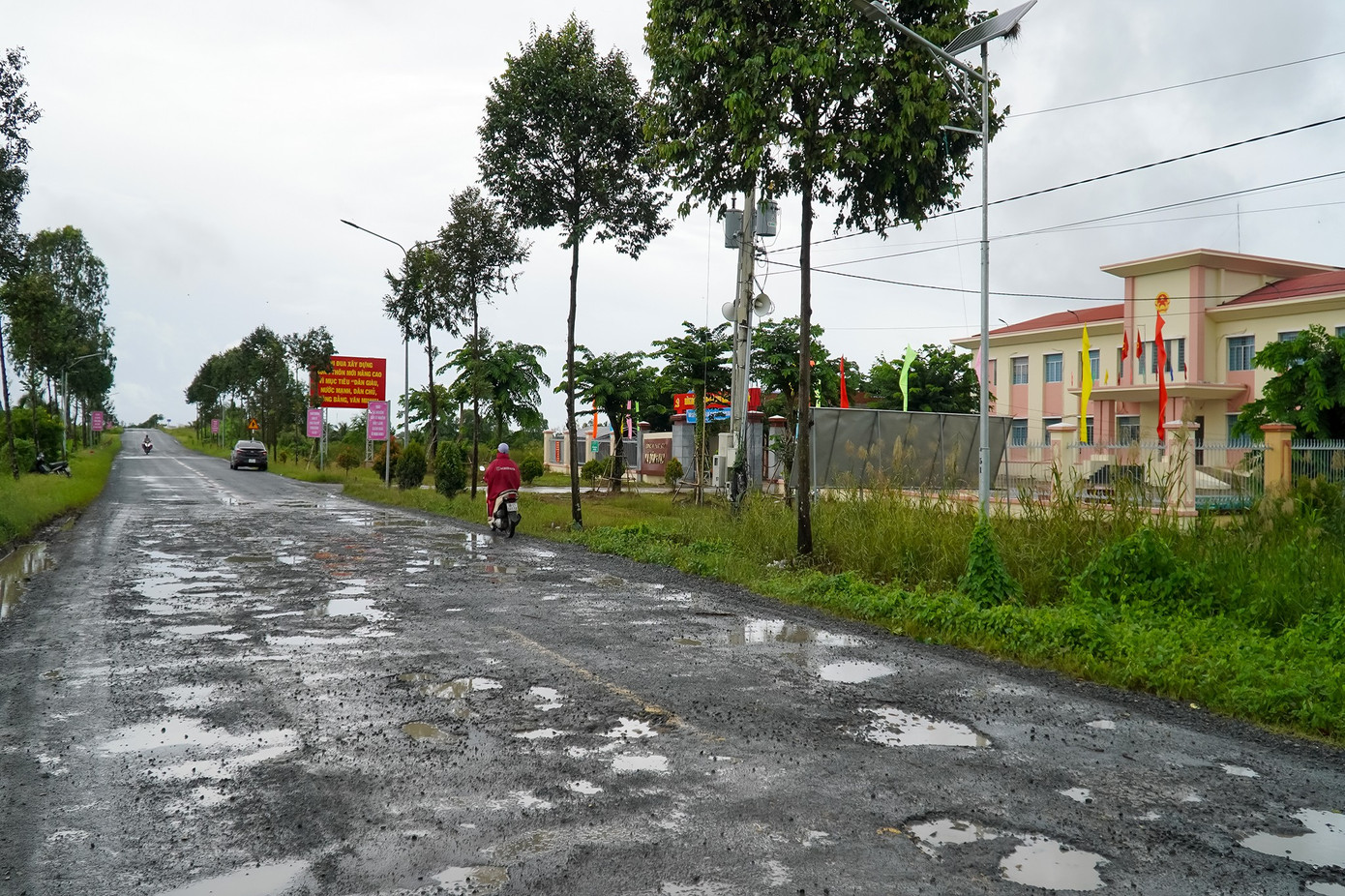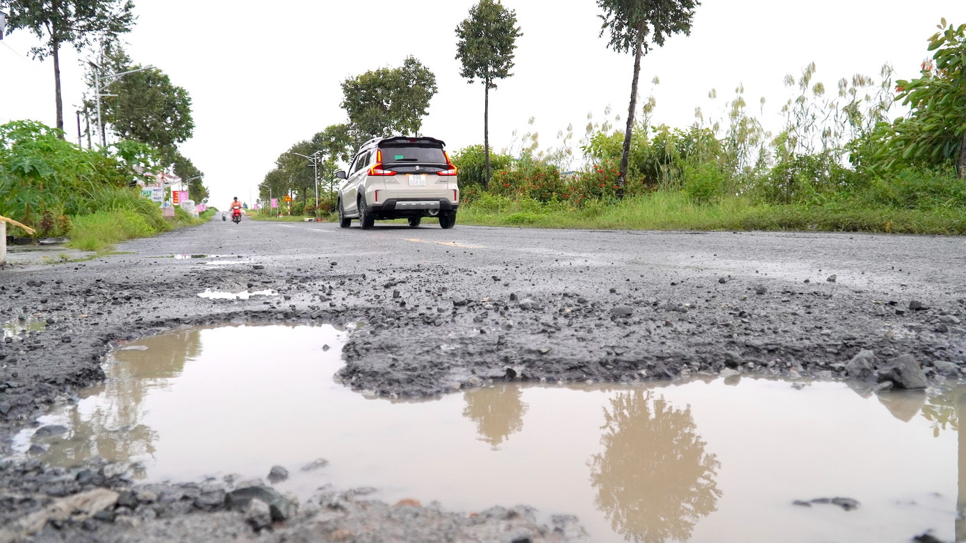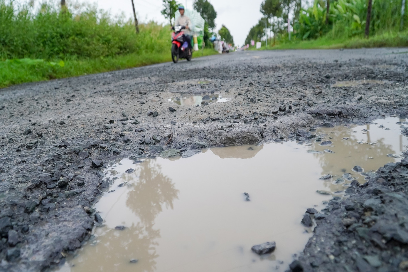 Mặt đường trên đoạn dài gần 30km bong tróc, lồi lõm, ổ gà - ổ voi xuất hiện dày đặc, nước ứ đọng, gây nguy hiểm cho người và phương tiện qua lại.