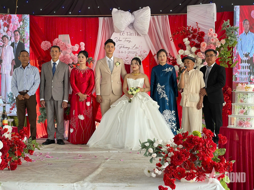 Giáp Tết Bính Ngọ, niềm vui ấy hiện lên trọn vẹn trong đám cưới của cô dâu Phương Liên và chú rể Văn Trọng. Phương Liên là giáo viên Trường THPT Nguyễn Đình Chiểu (xã Quảng Tín, tỉnh Lâm Đồng), trực tiếp đứng lớp dạy nhiều con em người lao động vùng dự án Trung đoàn 720. Văn Trọng là bộ đội Trung đoàn 915, Trường Sĩ quan Không quân. Một người “giữ chữ”, một người “giữ trời”, gặp nhau ở kỷ luật và trách nhiệm.