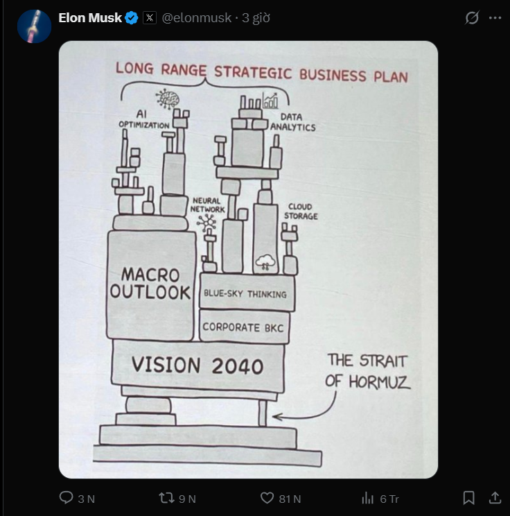 Thông qua bức ảnh vẽ tay, Elon Musk đã tạo ra một sự châm biếm đa tầng sâu sắc. Ở góc độ bề mặt, ông đang mỉa mai chính những công ty công nghệ đồng cấp. Họ vẽ ra những bản thuyết trình lấp lánh với vô số thuật ngữ thời thượng, hứa hẹn về một tương lai tự động hóa hoàn toàn. Nhưng khi lột bỏ lớp vỏ ngôn từ hào nhoáng ấy, nền kinh tế số vĩ đại vẫn phải chạy bằng một thứ nhiên liệu cổ điển: năng lượng giá rẻ và ổn định từ dầu mỏ. Không có dầu mỏ từ Hormuz, điện sẽ tăng giá, các trung tâm dữ liệu sẽ tê liệt, và "Tầm nhìn 2040" sẽ mãi chỉ là một tệp tài liệu trên máy tính.