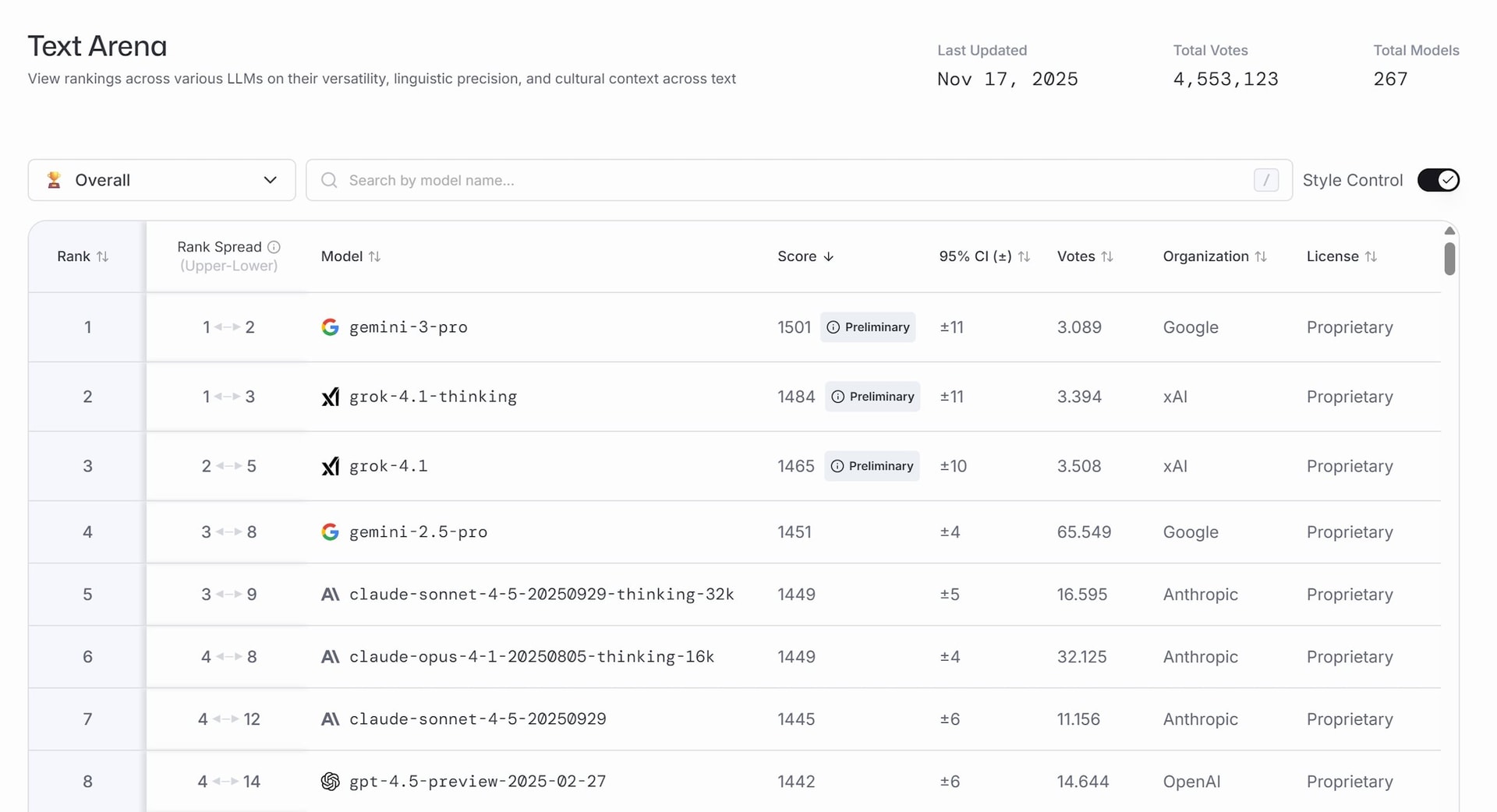 Google Gemini 3 Pro vừa chiếm vị trí số 1 của Grok 4.1 trên LMArena - Ảnh chụp màn hình