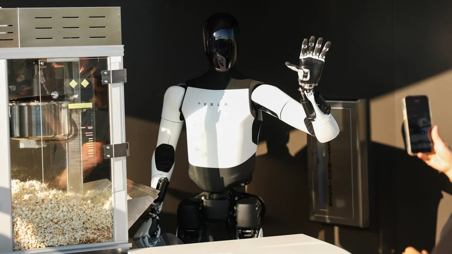 Optimus xúc bỏng ngô và vẫy tay chào những người tham dự lễ khai trương Tesla Diner, nhà hàng phục vụ đồ ăn nhanh và trạm sạc siêu tốc ở Hollywood - Ảnh: Getty Images