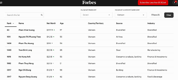 Danh sách 8 tỷ phú USD của Việt Nam - Nguồn: Forbes