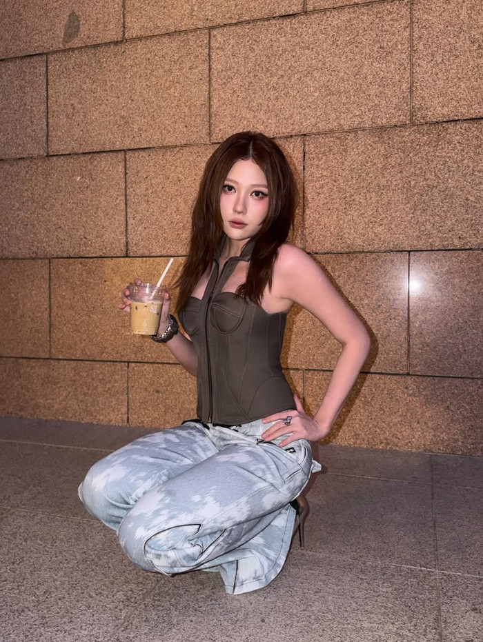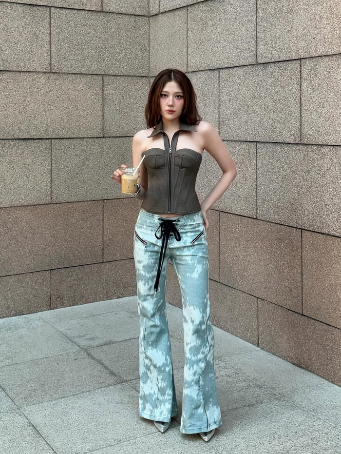 Trong loạt ảnh mới, Uyển Ân diện một chiếc áo cúp ngực dáng corset tôn trọn phần vai trần và vòng eo nhỏ gọn. Thiết kế ôm sát cơ thể giúp làm nổi bật đường cong mềm mại, kết hợp với tông màu trầm mang lại sự thời thượng mà không quá phô trương. Chiếc áo được phối cùng quần jean sáng màu, tạo nên tổng thể vừa năng động vừa cá tính. Lối trang điểm sắc nét càng giúp gương mặt của em gái Trấn Thành thêm phần cuốn hút.