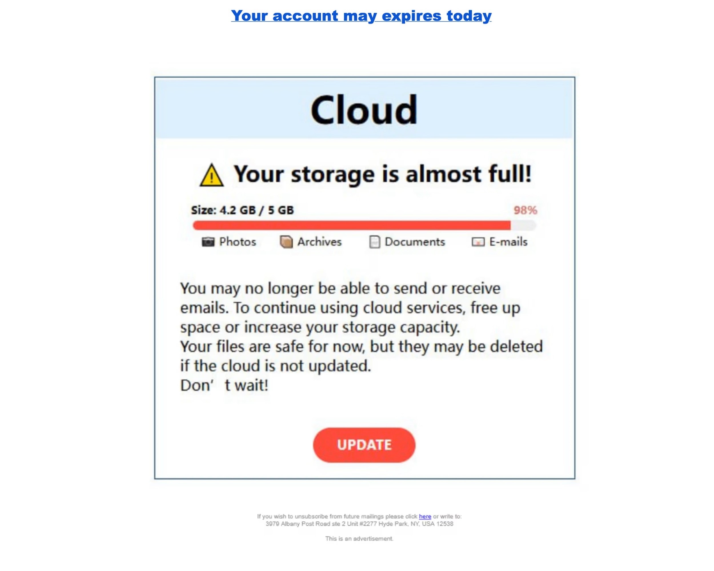 Các email này thường bắt đầu bằng một thông báo quen thuộc: "...tài khoản đã vượt quá dung lượng miễn phí, khiến ảnh và dữ liệu không thể tiếp tục sao lưu." Ngay sau đó, mức độ cảnh báo được đẩy lên nhanh chóng. Người nhận được yêu cầu “nâng cấp ngay” để tránh việc tài khoản bị khóa, dịch vụ bị vô hiệu hóa hoặc toàn bộ dữ liệu bị xóa.
