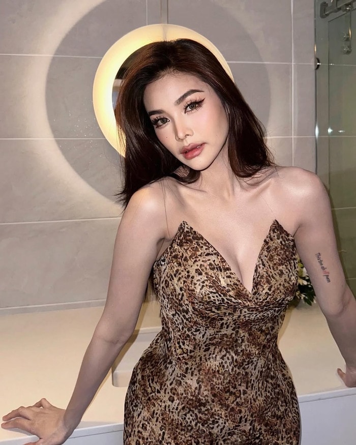 Trong bộ ảnh, Engfa Wahara diện trang phục mang tông màu nâu-beige chủ đạo, gồm một chiếc áo blazer có phom dáng chuẩn kết hợp cùng cà vạt. Điểm nhấn đặc biệt là cách cô để lộ phần ngực một cách khéo léo, tạo nên vẻ quyến rũ nhưng không gây phản cảm.