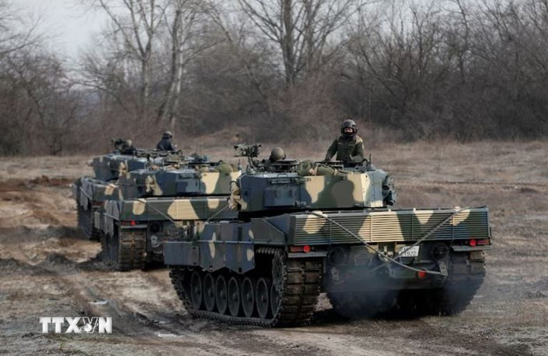 Xe tăng Leopard 2A4 của Đức tham gia tập trận gần Tata, Hungary ngày 6/2/2023. (Ảnh: REUTERS/TTXVN)