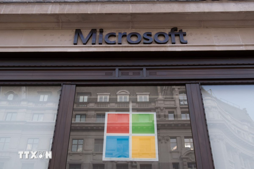 Biểu tượng Microsoft tại cửa hàng ở London, Anh. (Ảnh: Kyodo/TTXVN)