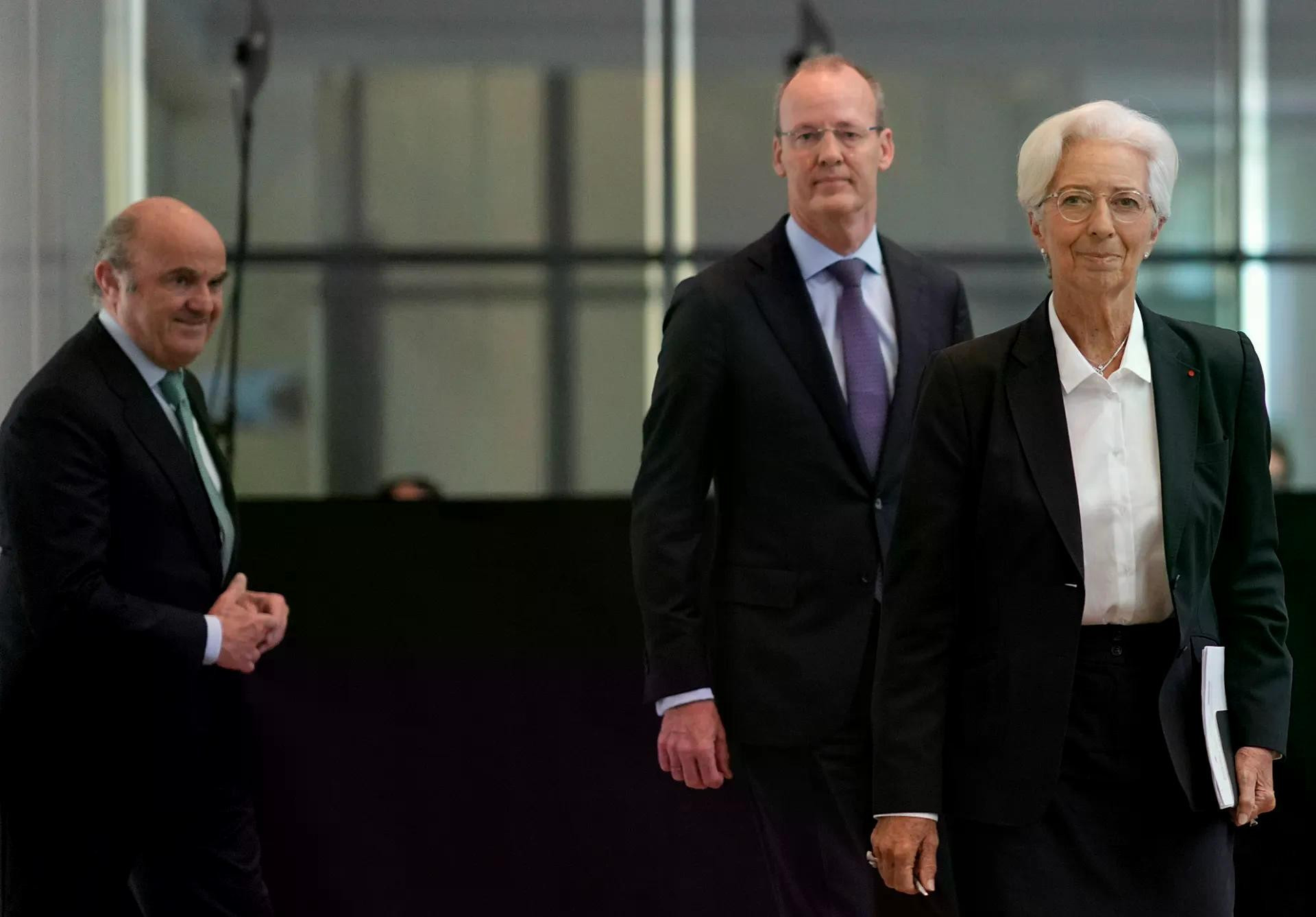 Chủ tịch ECB Christine Lagarde, Phó Chủ tịch ECB Luis de Guindos và Chủ tịch Ngân hàng Trung ương Hà Lan (DNB) Klaas Knot đến tham dự một cuộc họp báo tại Amsterdam, Hà Lan