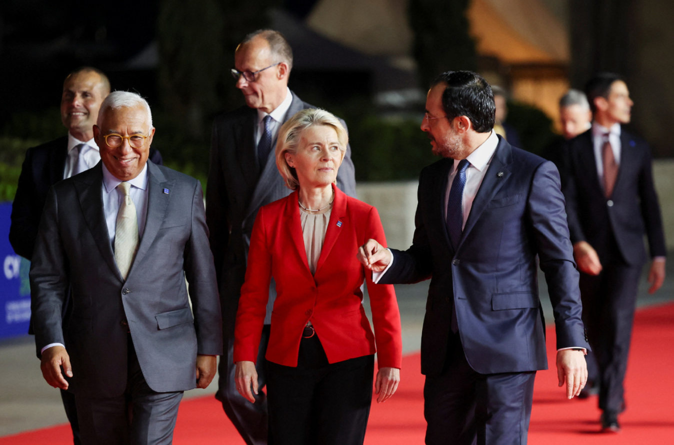 Tổng thống Síp Nikos Christodoulides trò chuyện với Chủ tịch Ủy ban châu Âu Ursula von der Leyen khi tham dự Hội nghị thượng đỉnh không chính thức của các nhà lãnh đạo châu Âu tại Ayia Napa, Síp, ngày 23/4. Ảnh: Xinhua